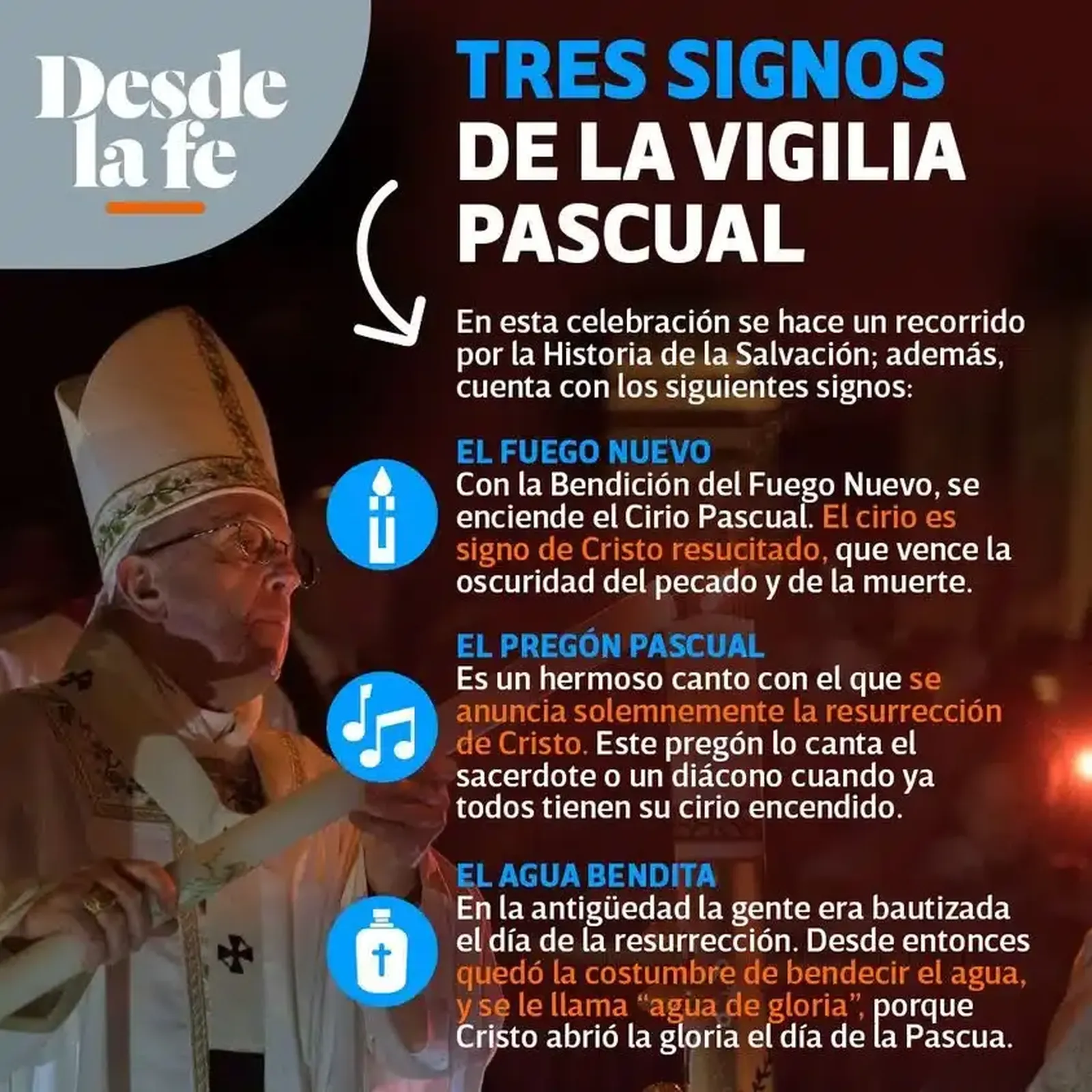 - Lucernario: Se enciende y bendice el fuego nuevo, que simboliza la luz de Cristo resucitado, que en medio de la oscuridad, nos llena con su luz. A partir de este fuego nuevo, se enciende el Cirio Pascual, que nos atrae a Cristo, que ilumina con su luz a todo el mundo, sacándonos de las tinieblas y guiándonos hacia Él.