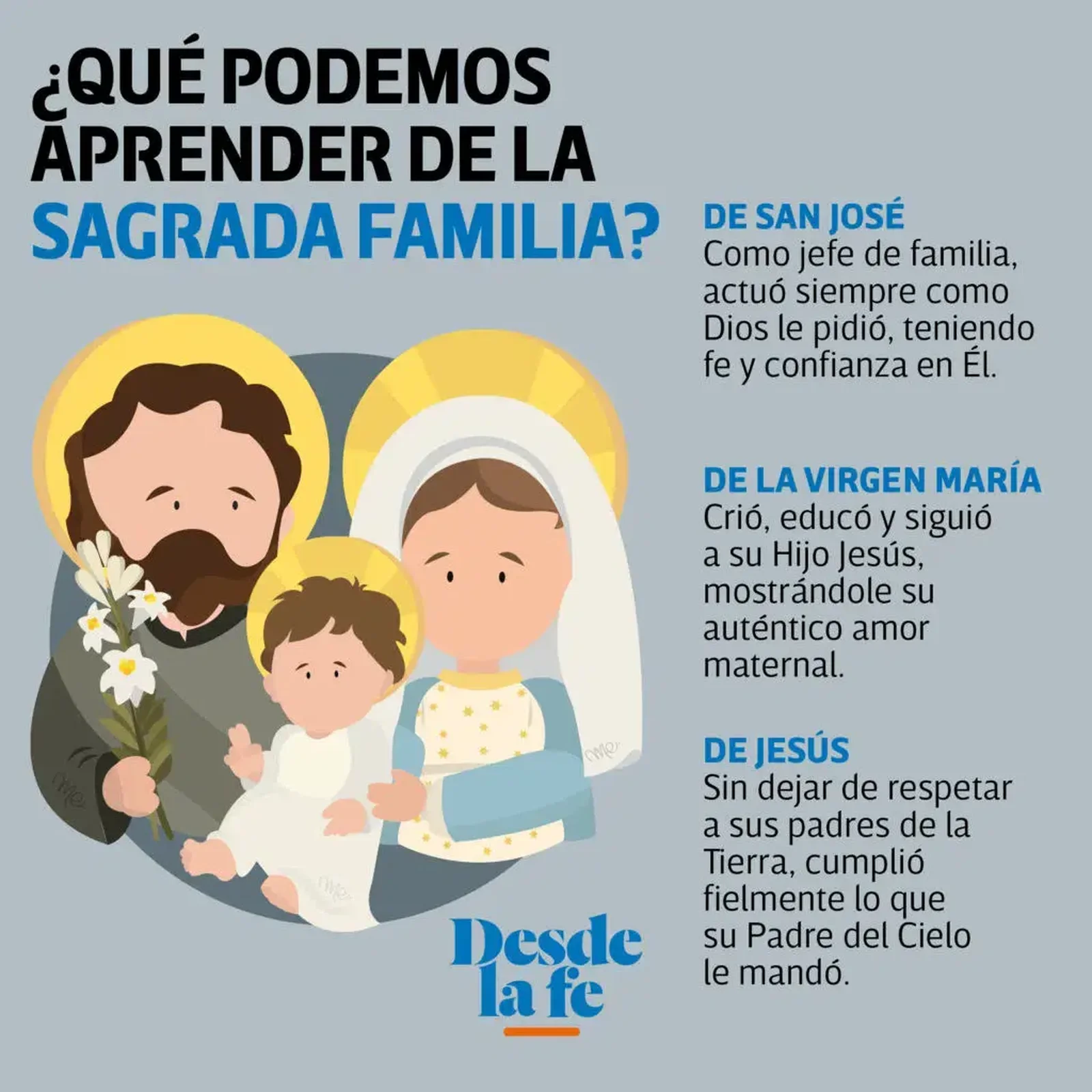 - La Educación en la Fe: Jesús creció en un ambiente donde se le inculcaron valores y fe. La Sagrada Familia, debe ser el testimonio de la imperiosa necesidad de educar en la fe a los hijos, así como en el amor al prójimo, formando a los hijos en esos valores cristianos que los guiarán durante toda su vida. No hay que olvidar que en su momento, Jesús recibió las enseñanzas y valores judíos.