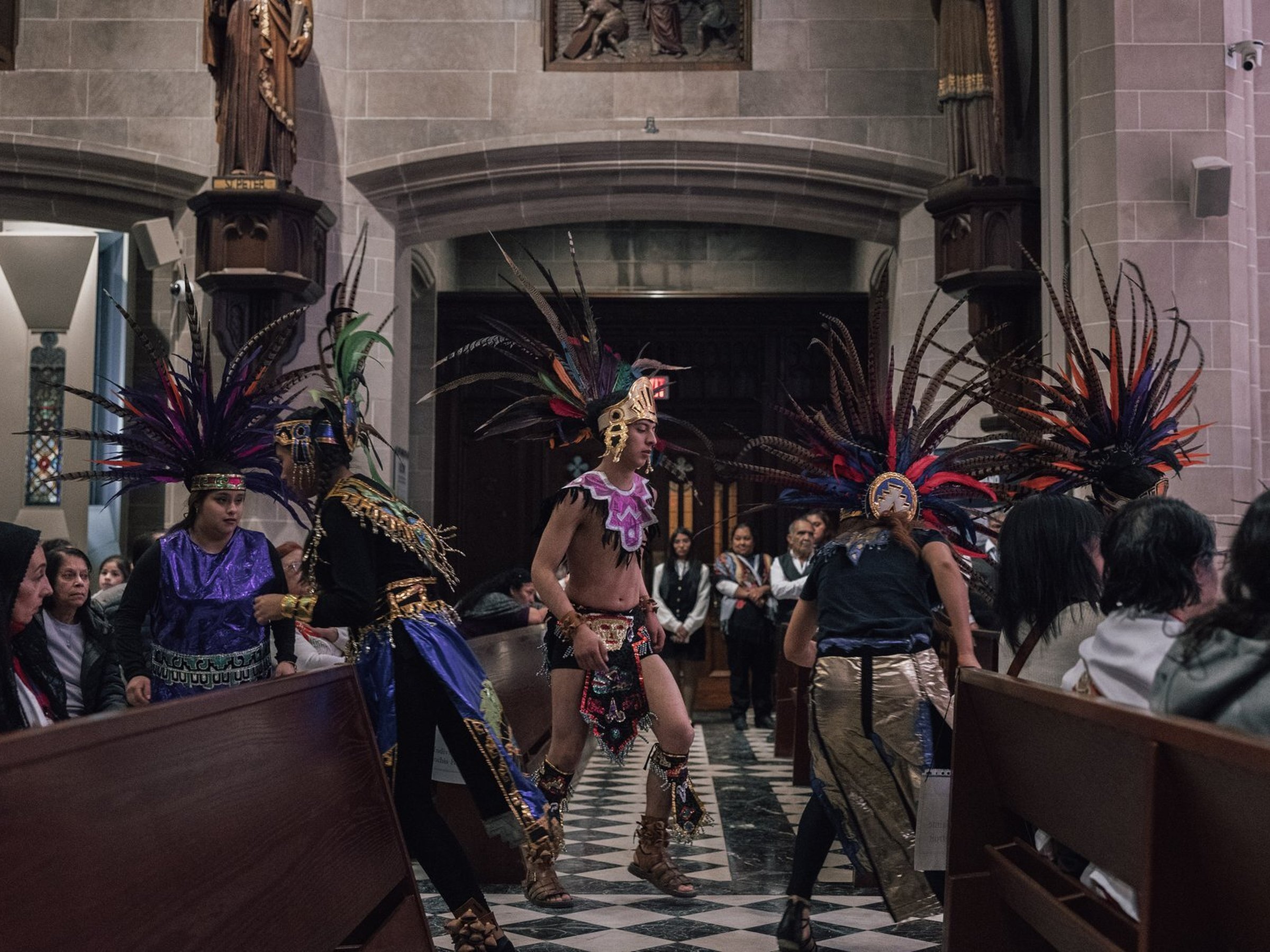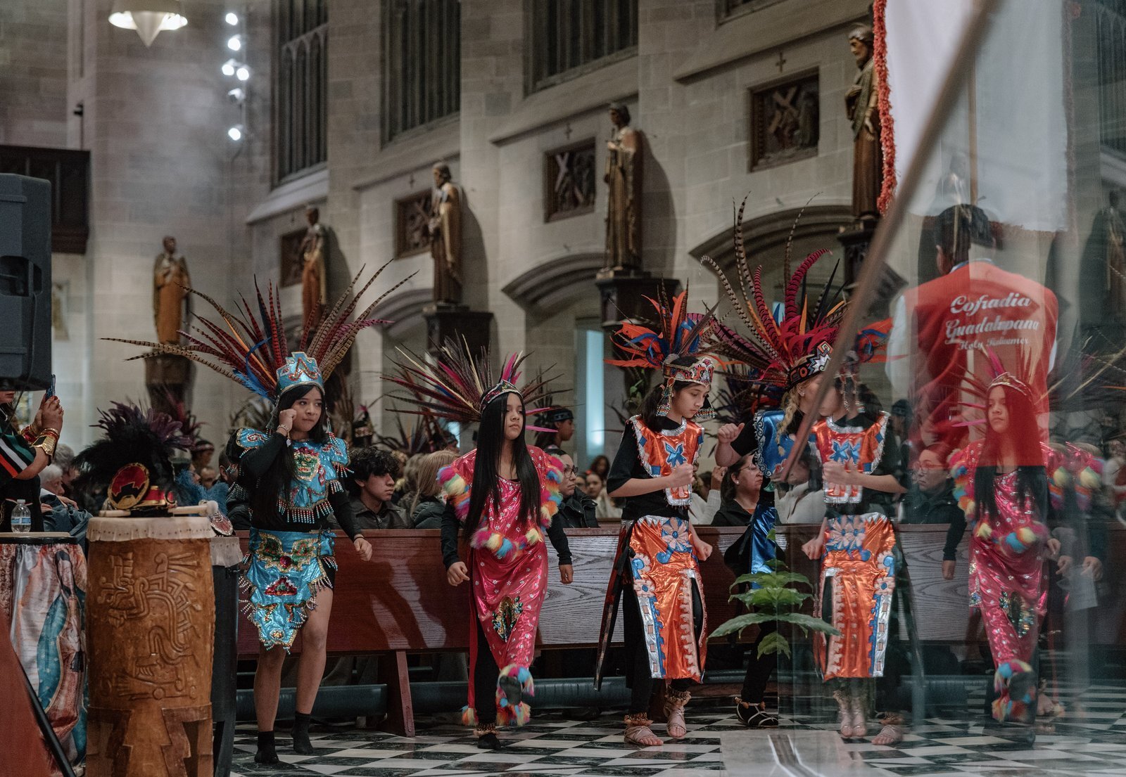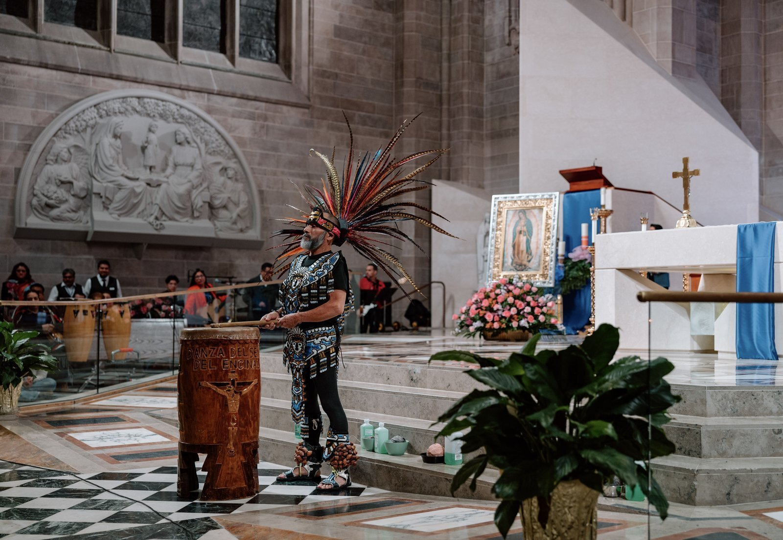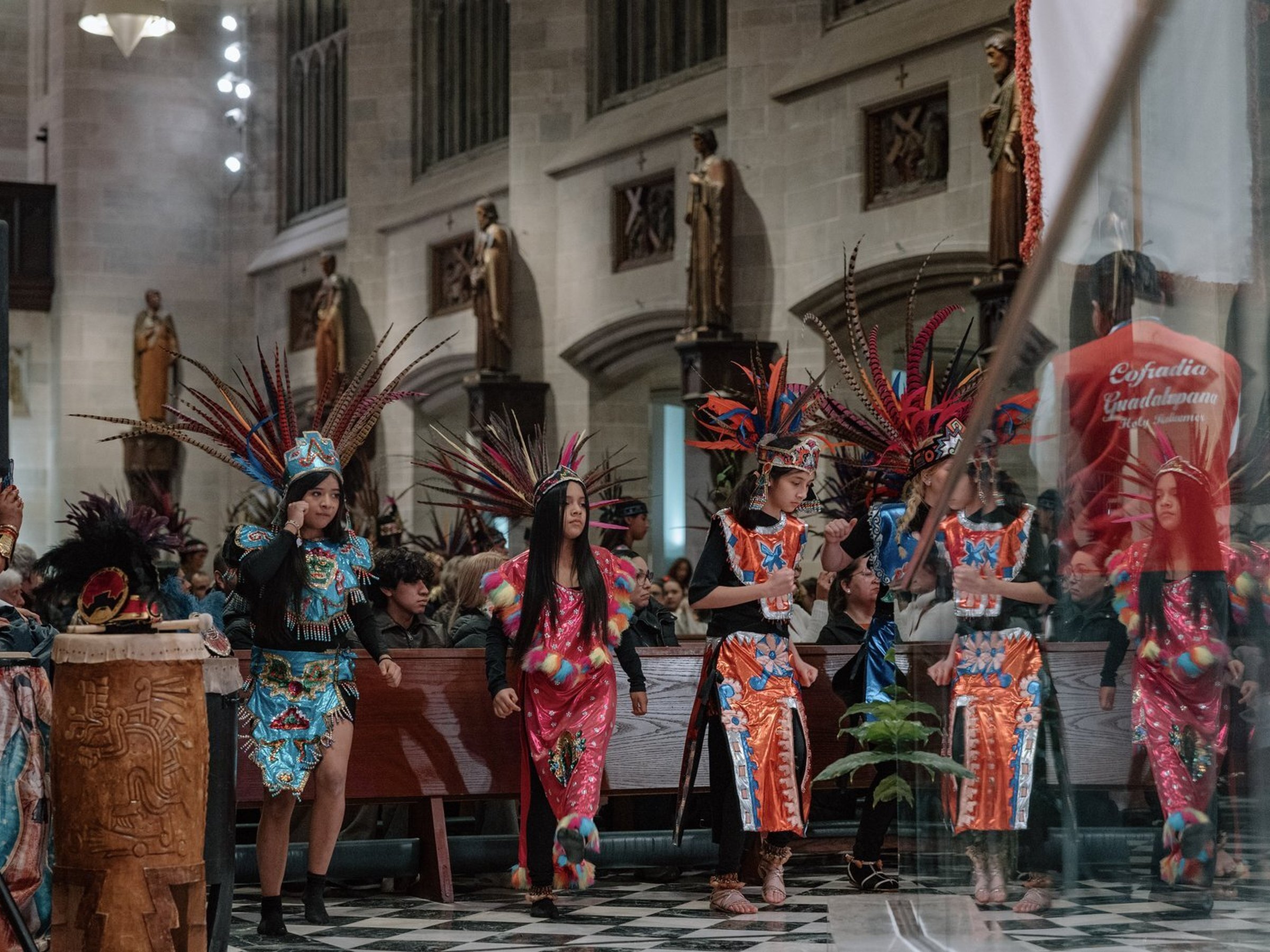 Durante el programa previo, los danzantes conocidos como concheros se presentaron con atuendos tradicionales de inspiración azteca, en homenaje al pueblo al que se apareció la Virgen, especialmente a san Juan Diego, cuya tilma conserva su imagen.