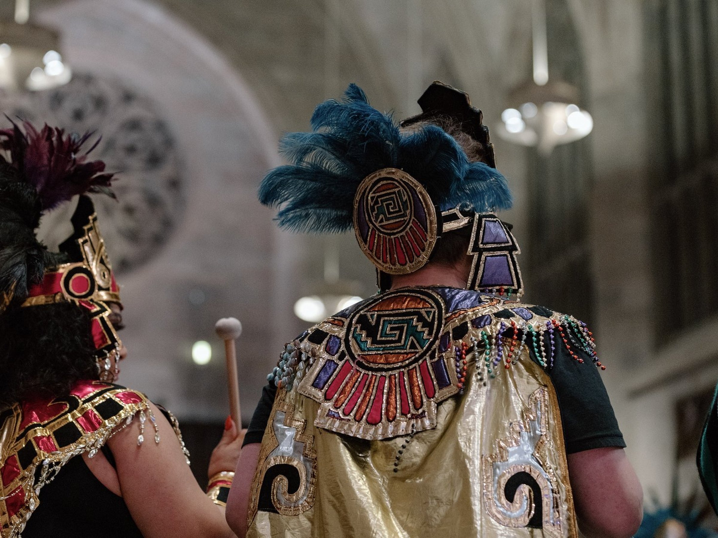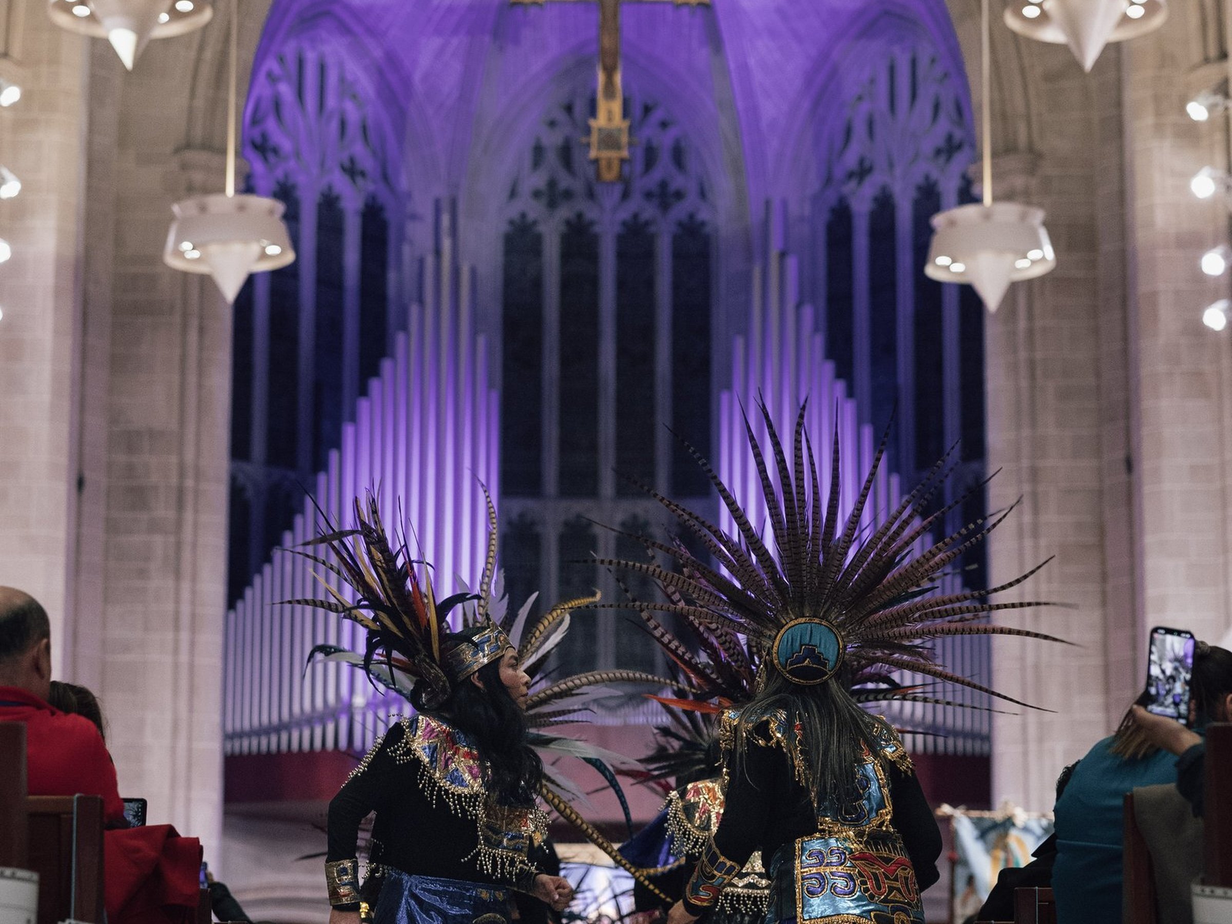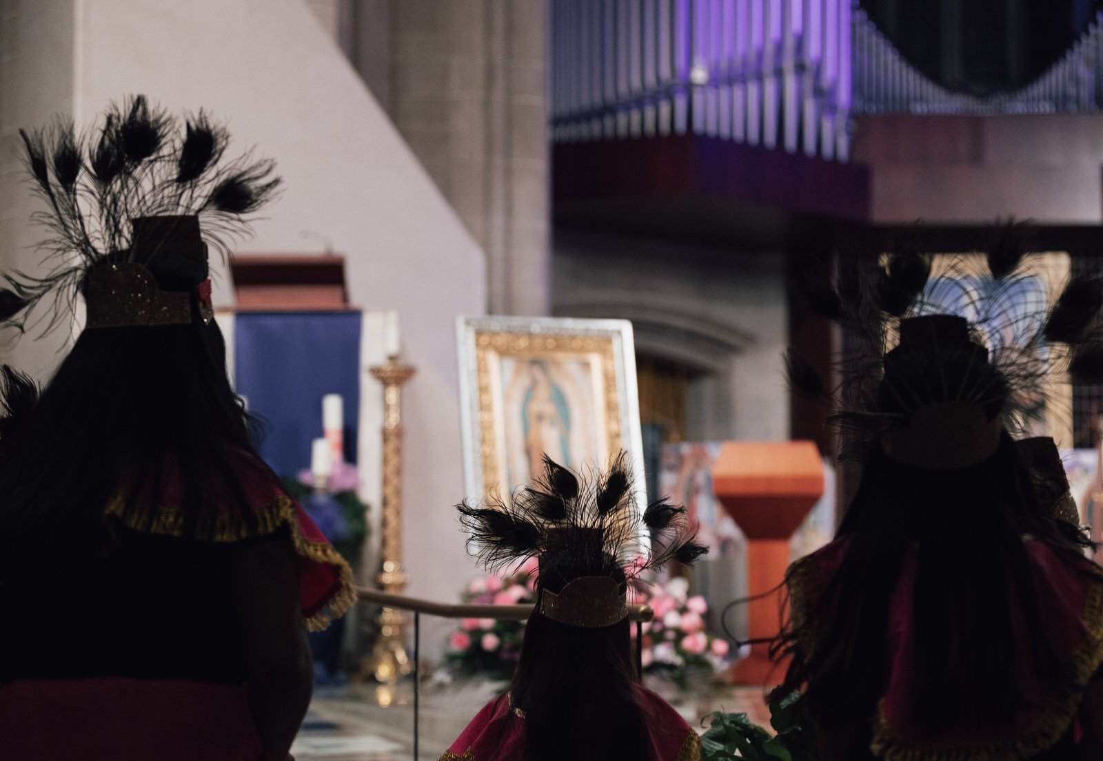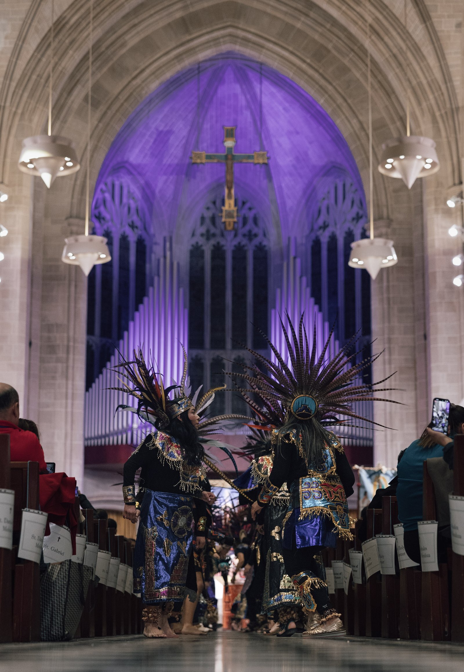 Durante el programa previo, los danzantes conocidos como concheros se presentaron con atuendos tradicionales de inspiración azteca, en homenaje al pueblo al que se apareció la Virgen, especialmente a san Juan Diego, cuya tilma conserva su imagen.