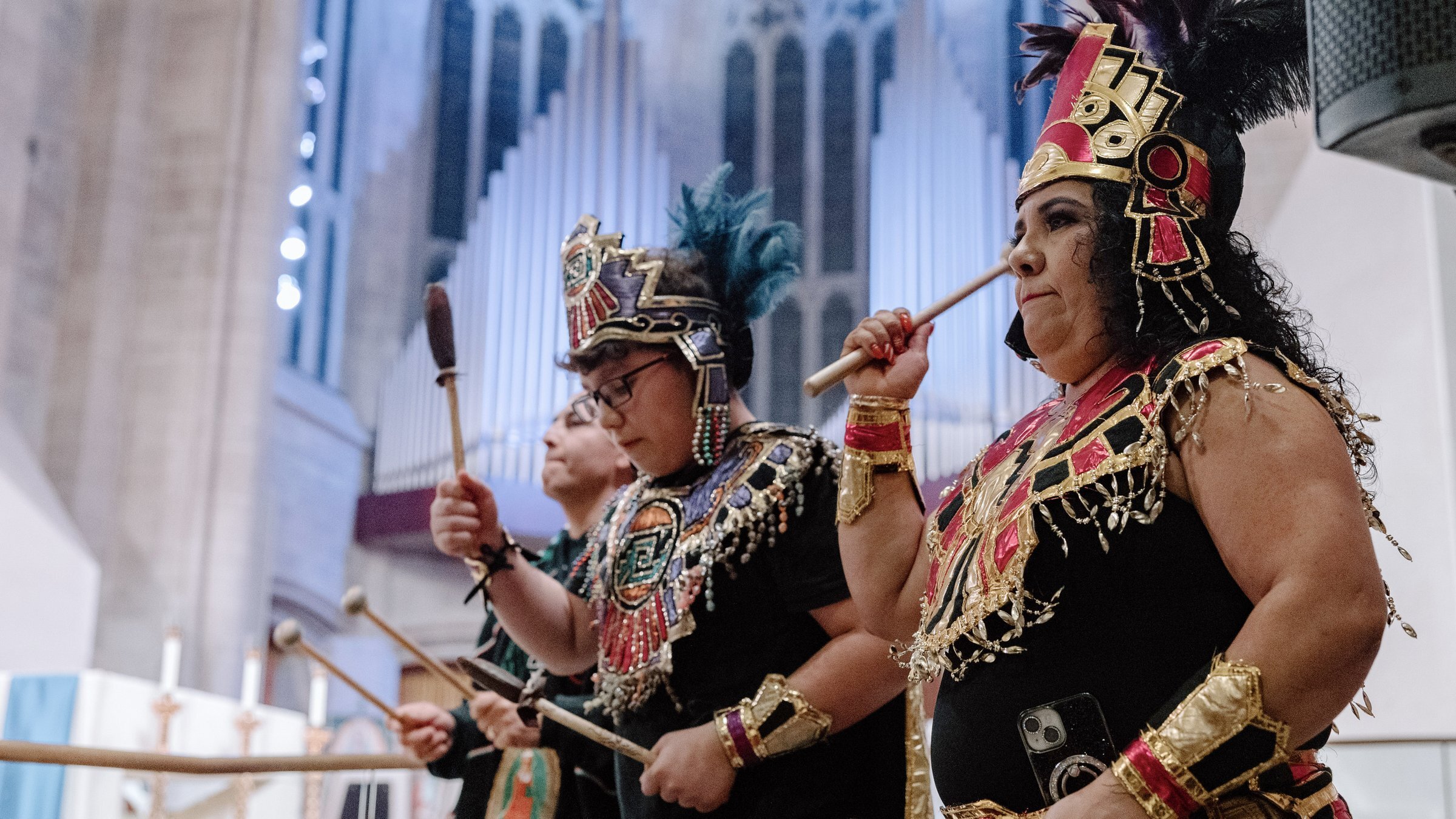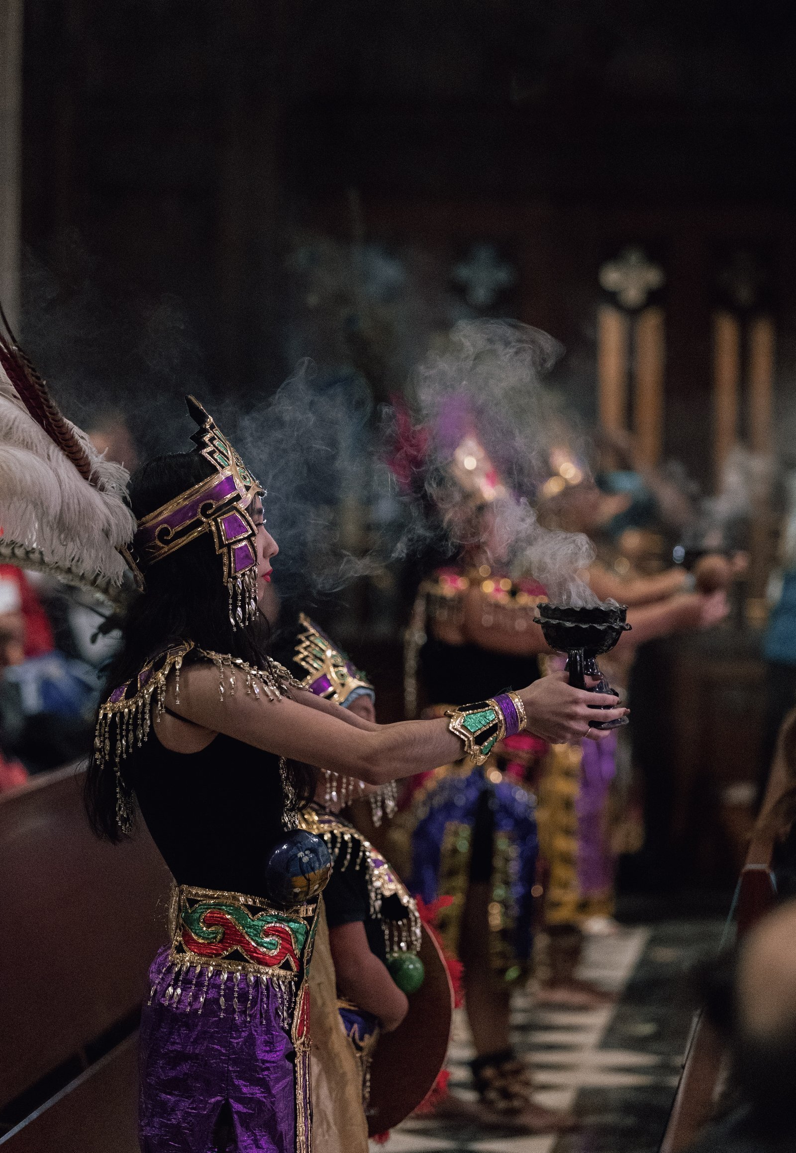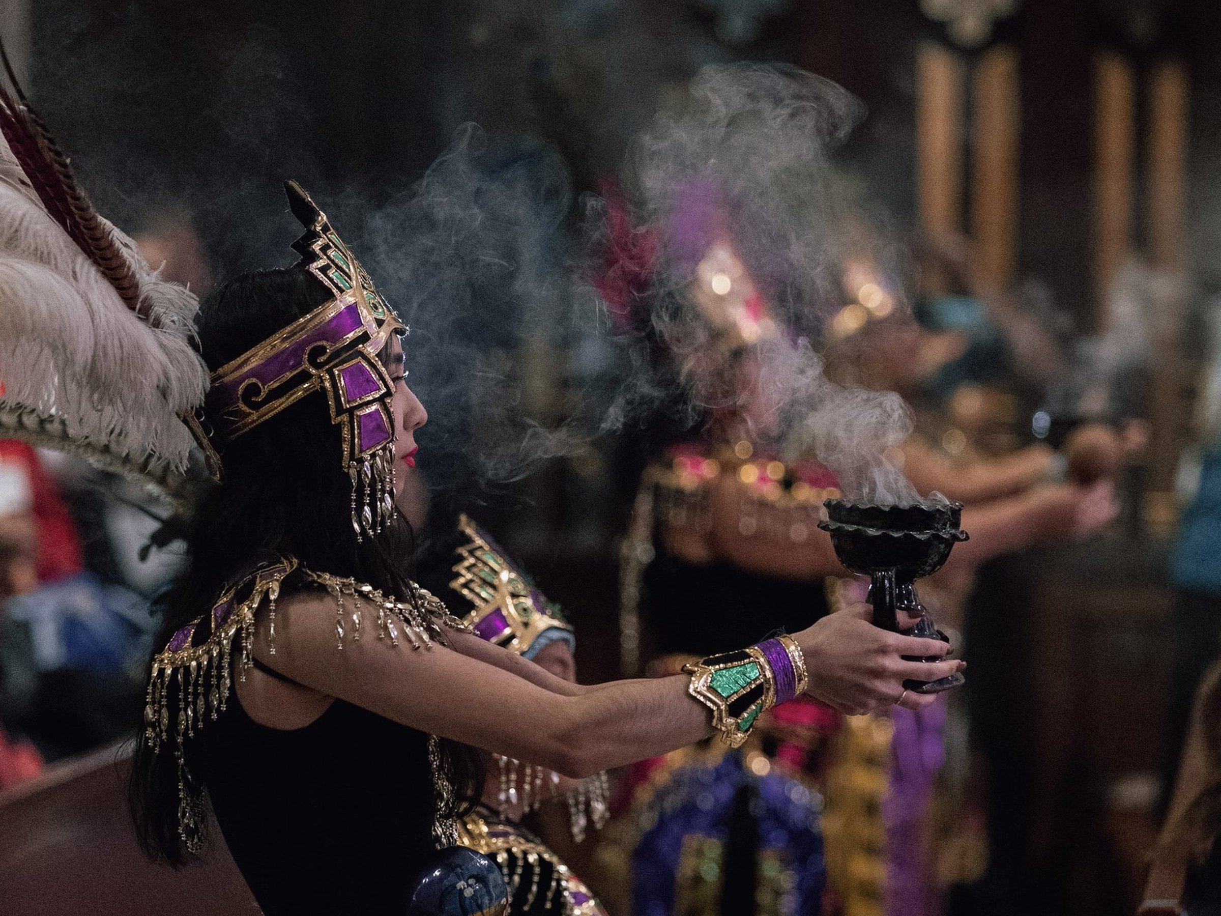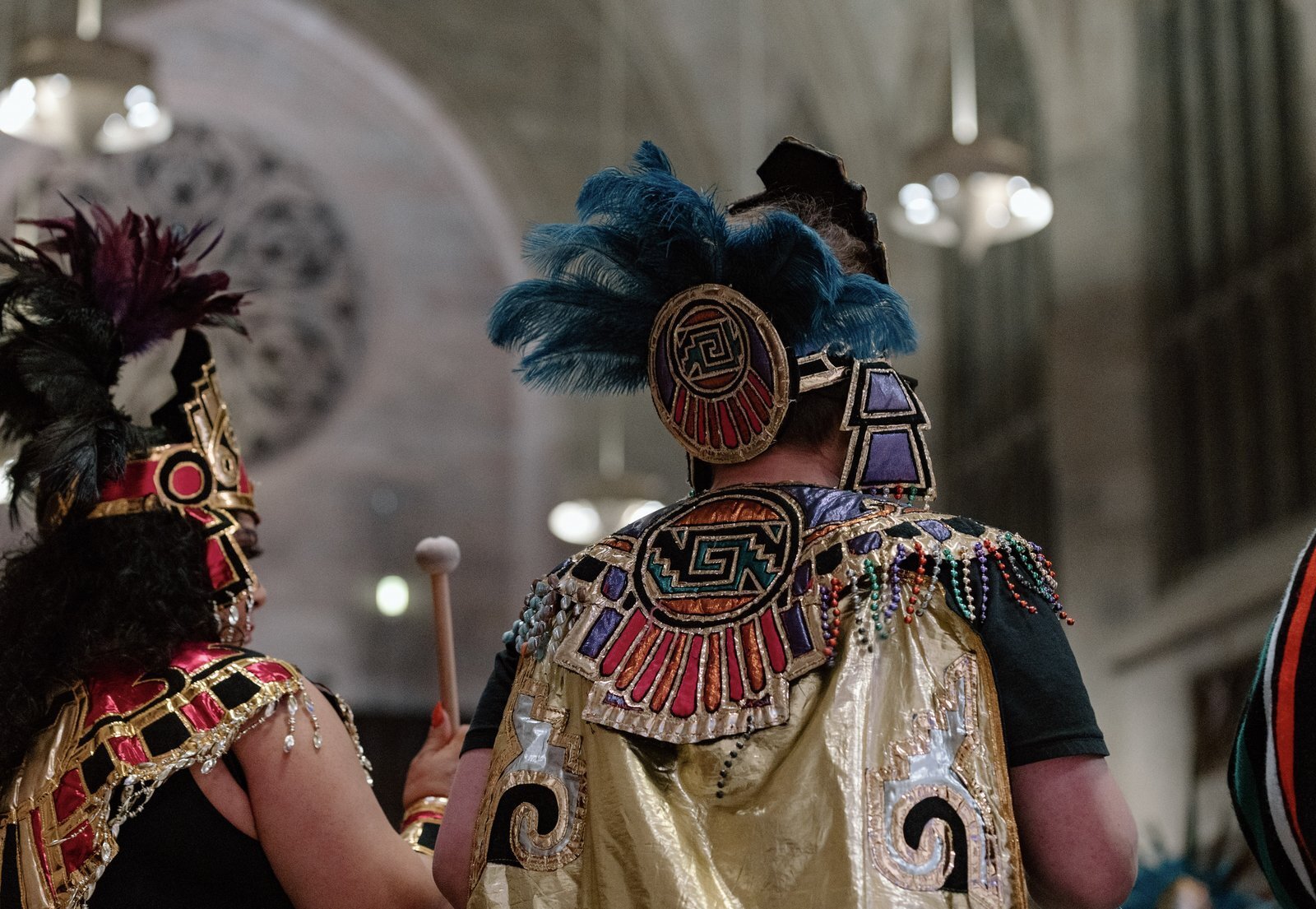 Durante el programa previo, los danzantes conocidos como concheros se presentaron con atuendos tradicionales de inspiración azteca, en homenaje al pueblo al que se apareció la Virgen, especialmente a san Juan Diego, cuya tilma conserva su imagen.