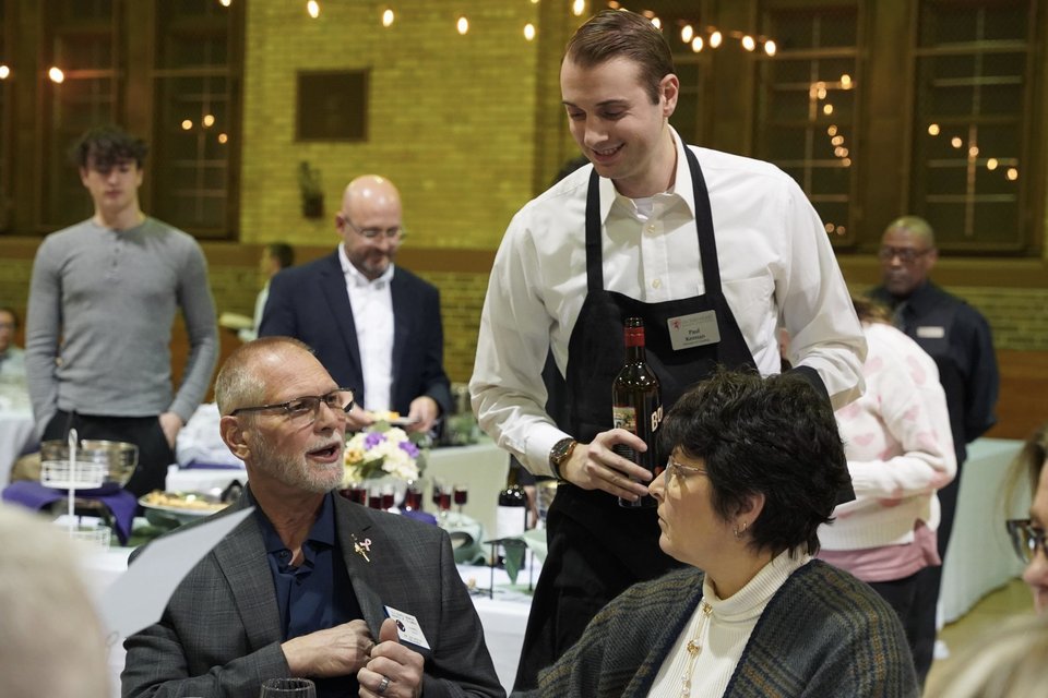El seminarista de Detroit Christian Pulido se ofreció como mesero para la recaudación de fondos. Este fue su cuarto año como voluntario, encargándose de rellenar las jarras de agua, servir vino y levantar las mesas durante la cena.