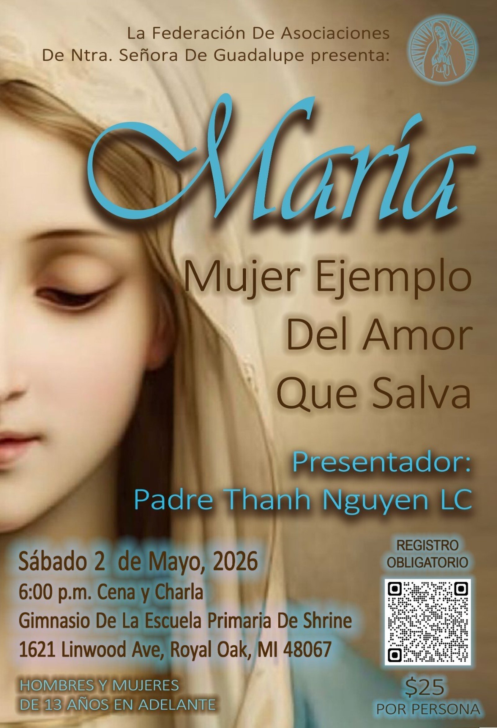 La comunidad hispana de la Arquidiócesis de Detroit tendrá una nueva oportunidad de formación y encuentro el sábado 2 de mayo a las 6 p.m., con una charla titulada “María, mujer ejemplo del amor que salva”. El encuentro se realizará en el gimnasio de la escuela primaria de Shrine, en Royal Oak, e incluirá cena, exposición y un espacio para preguntas. El costo es de $25 y se requiere inscripción previa.