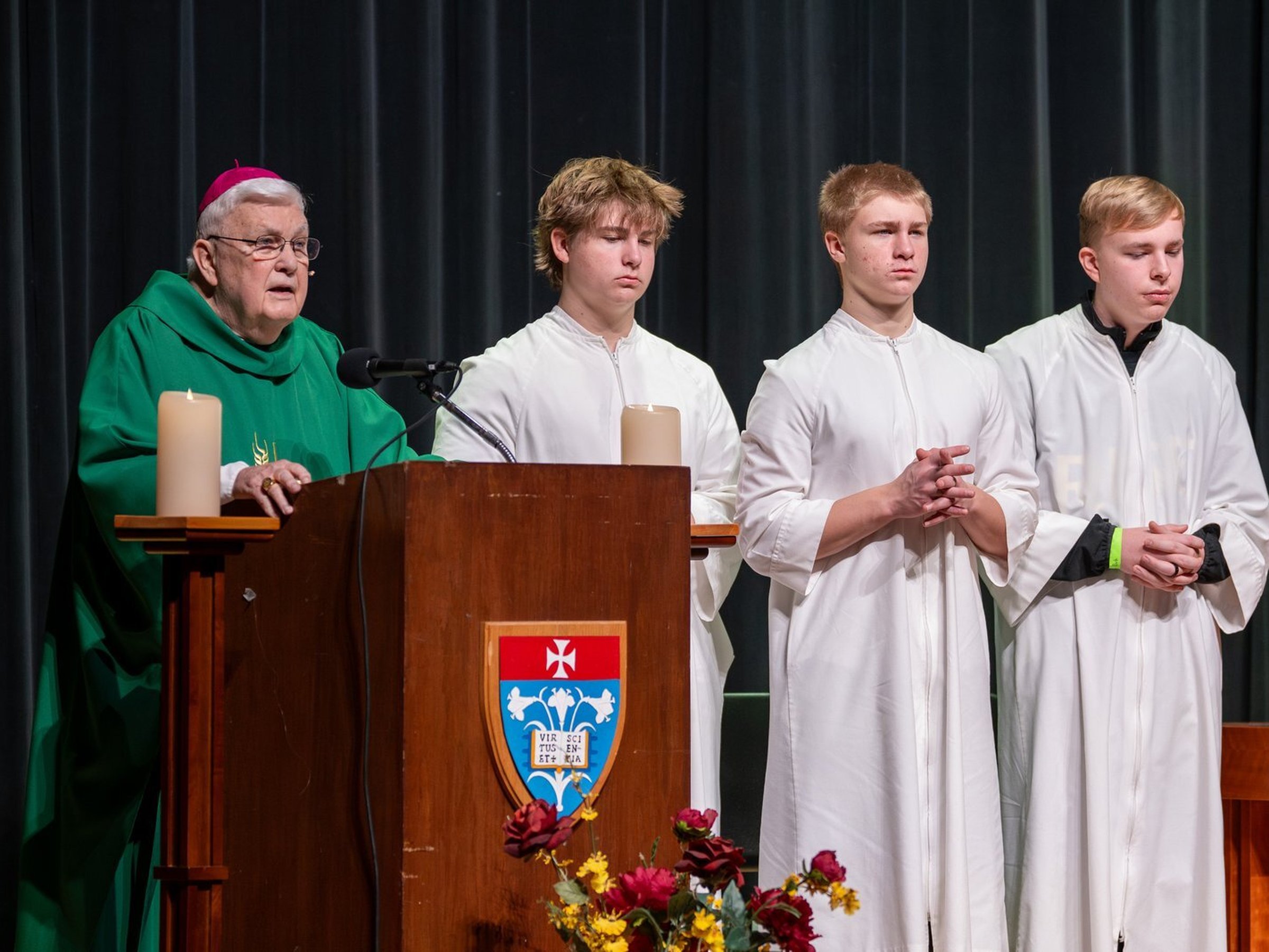 El obispo John M. Quinn, obispo emérito de la diócesis de Winona-Rochester y ex obispo auxiliar de la Arquidiócesis de Detroit (2003–2008), celebró la Misa junto a los estudiantes.