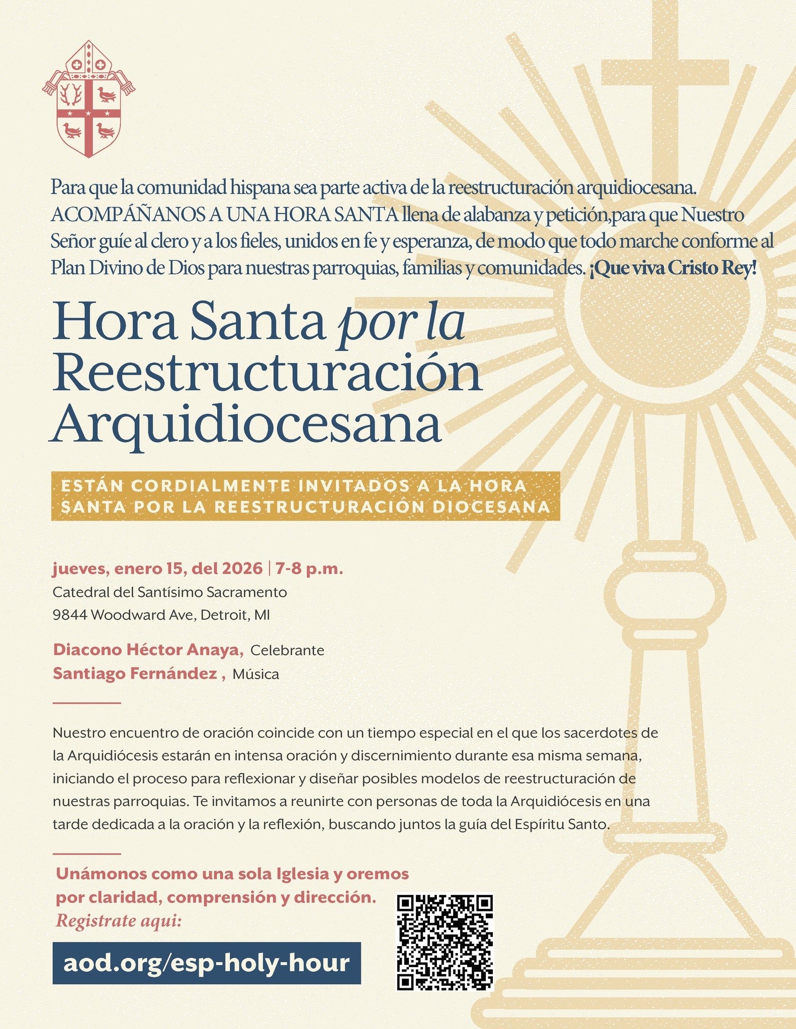 La Hora Santa en español se llevará a cabo el jueves 15 de enero, de 7:00 a 8:00 p.m., en la Cathedral of the Most Blessed Sacrament, y estará presidida por el diácono Héctor Anaya, con música a cargo de Santiago Fernández. El evento es gratuito y está abierto a toda la comunidad; se recomienda registrarse, aunque no es obligatorio.