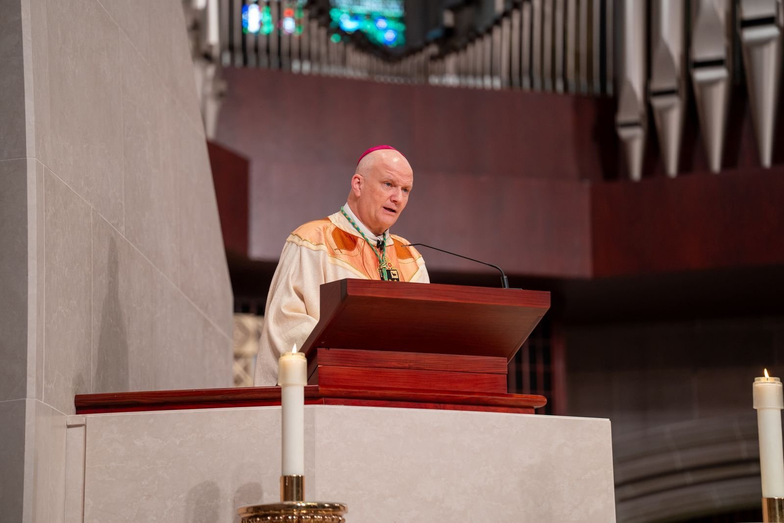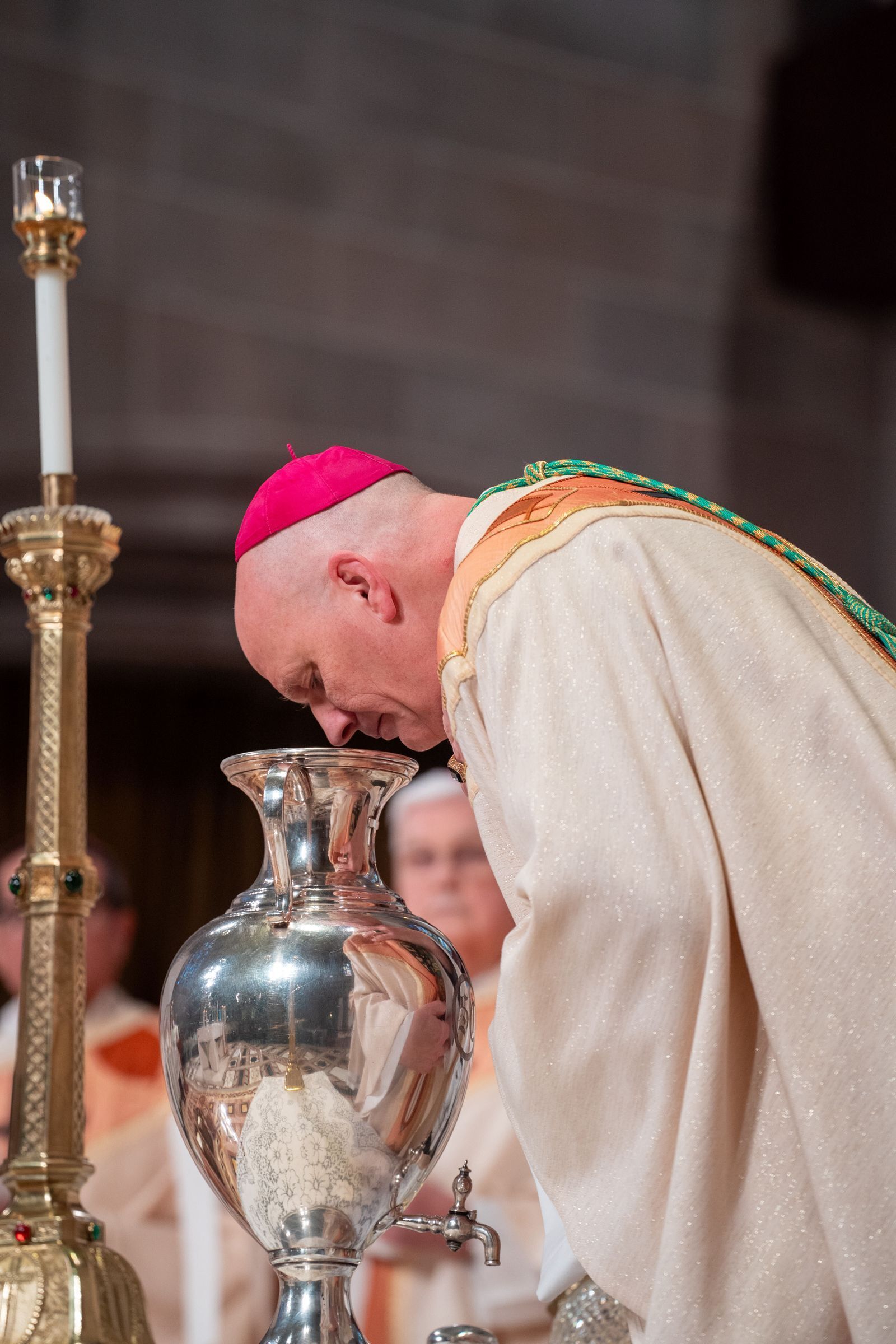 “Las Escrituras y la historia de la Iglesia nos muestran que no podemos controlar adónde llega el crisma, así como no poemos controlar las cosas de Dios”, dijo el Arzobispo Weisenburger a los cientos de sacerdotes presentes en la Cathedral of the Most Blessed Sacrament.