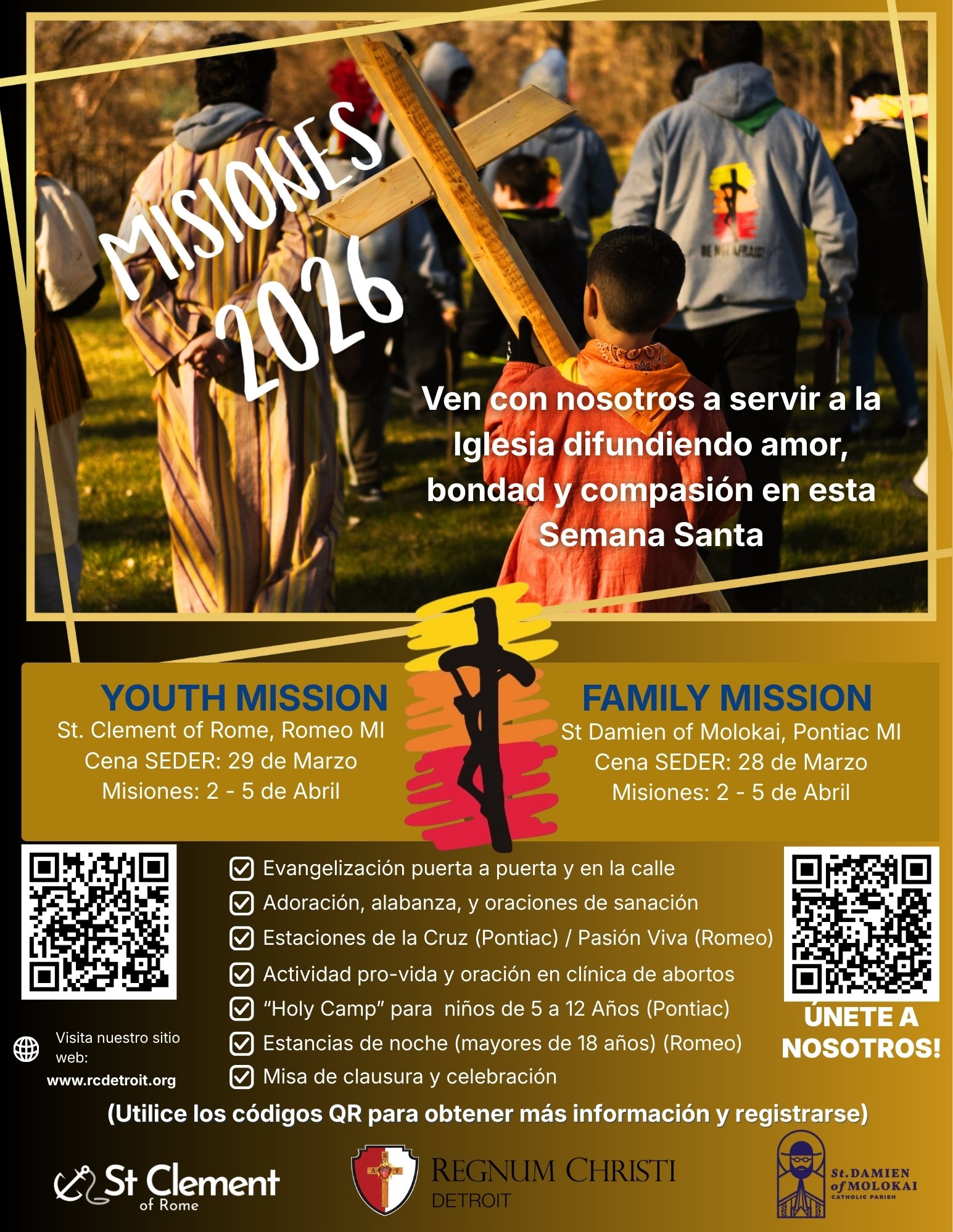 Ese mismo espíritu anima hoy a los jóvenes y familias de Regnum Christi en el área de Detroit, que se preparan para vivir las misiones de Semana Santa 2026 con una novedad significativa: por primera vez, Juventud Misionera y Familia Misionera realizarán sus misiones por separado.