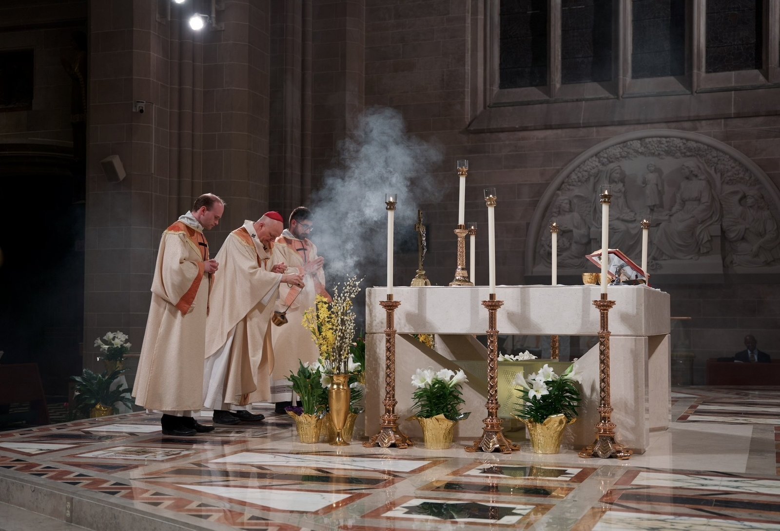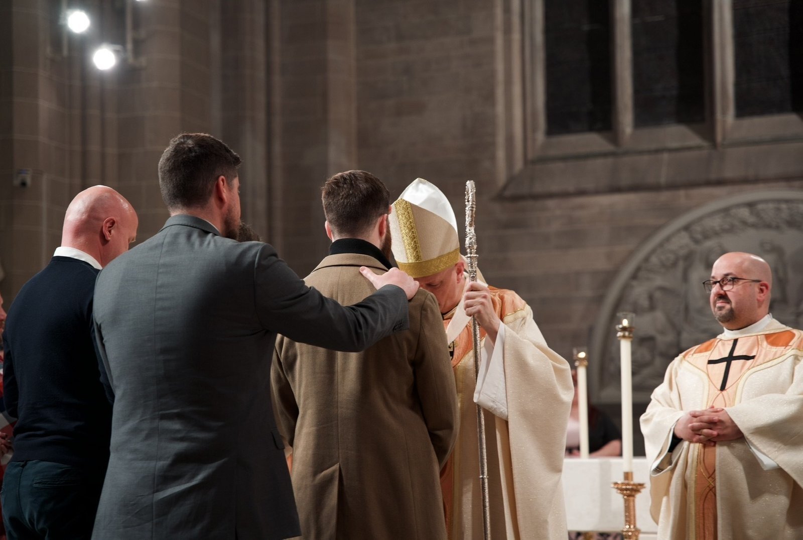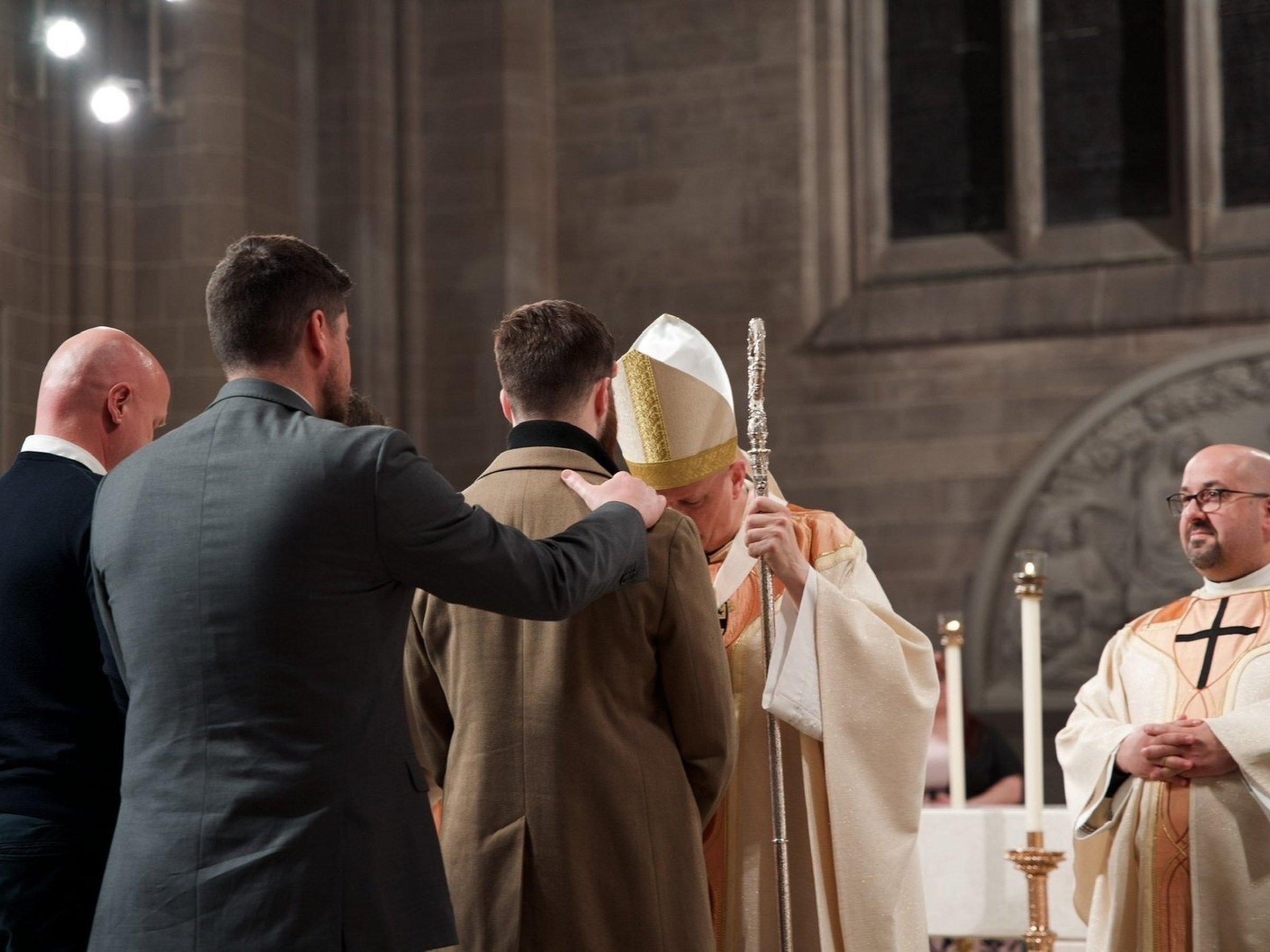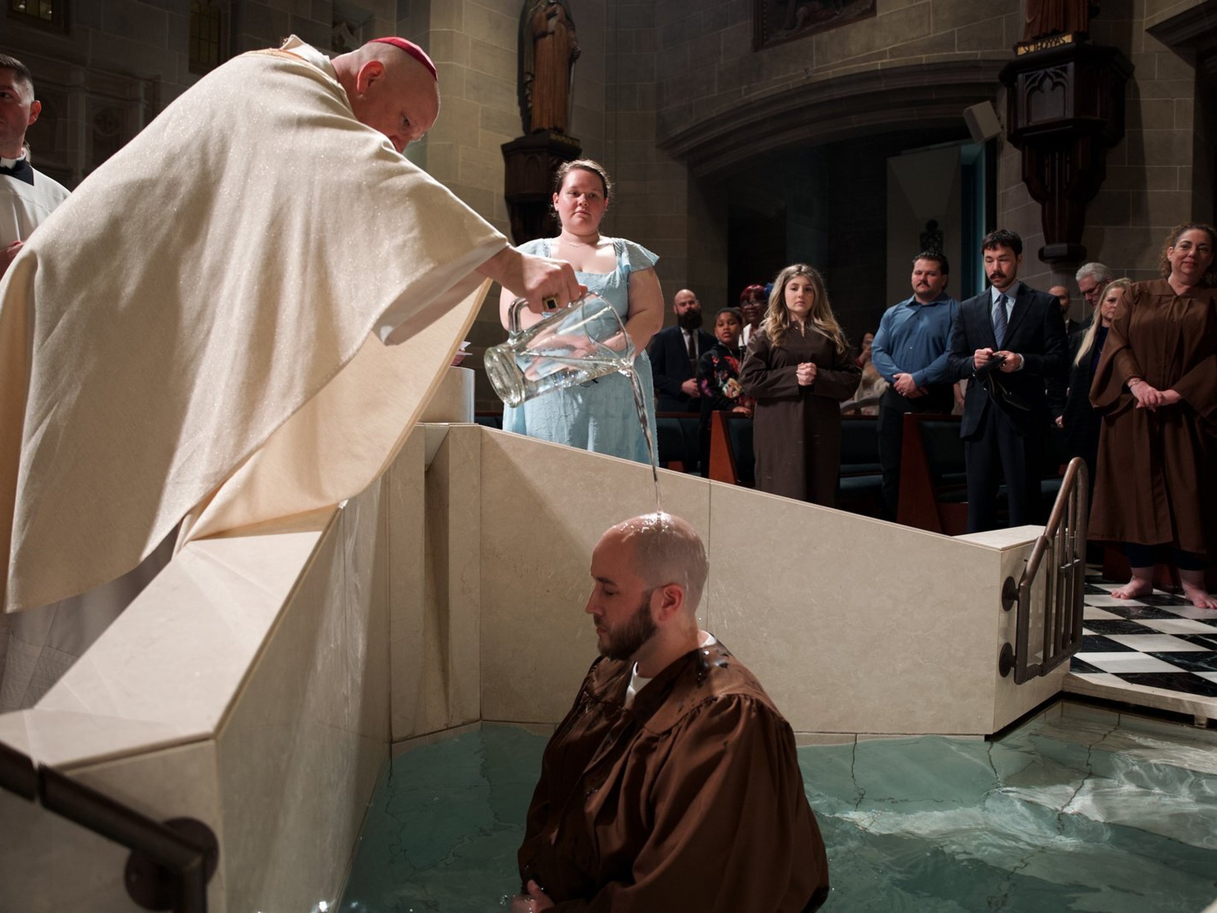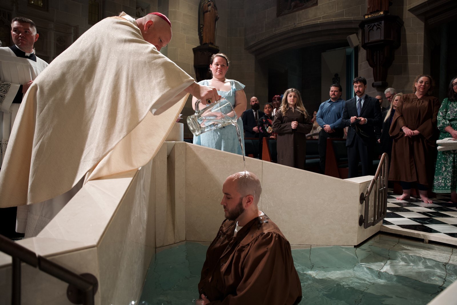 Tras la homilía del arzobispo, condujo a los catecúmenos y a sus padrinos al fondo de la catedral, donde los recién bautizados se arrodillaron en la pila bautismal mientras el arzobispo vertía agua sobre sus cabezas, dándoles la bienvenida a la Iglesia en nombre de la Santísima Trinidad.