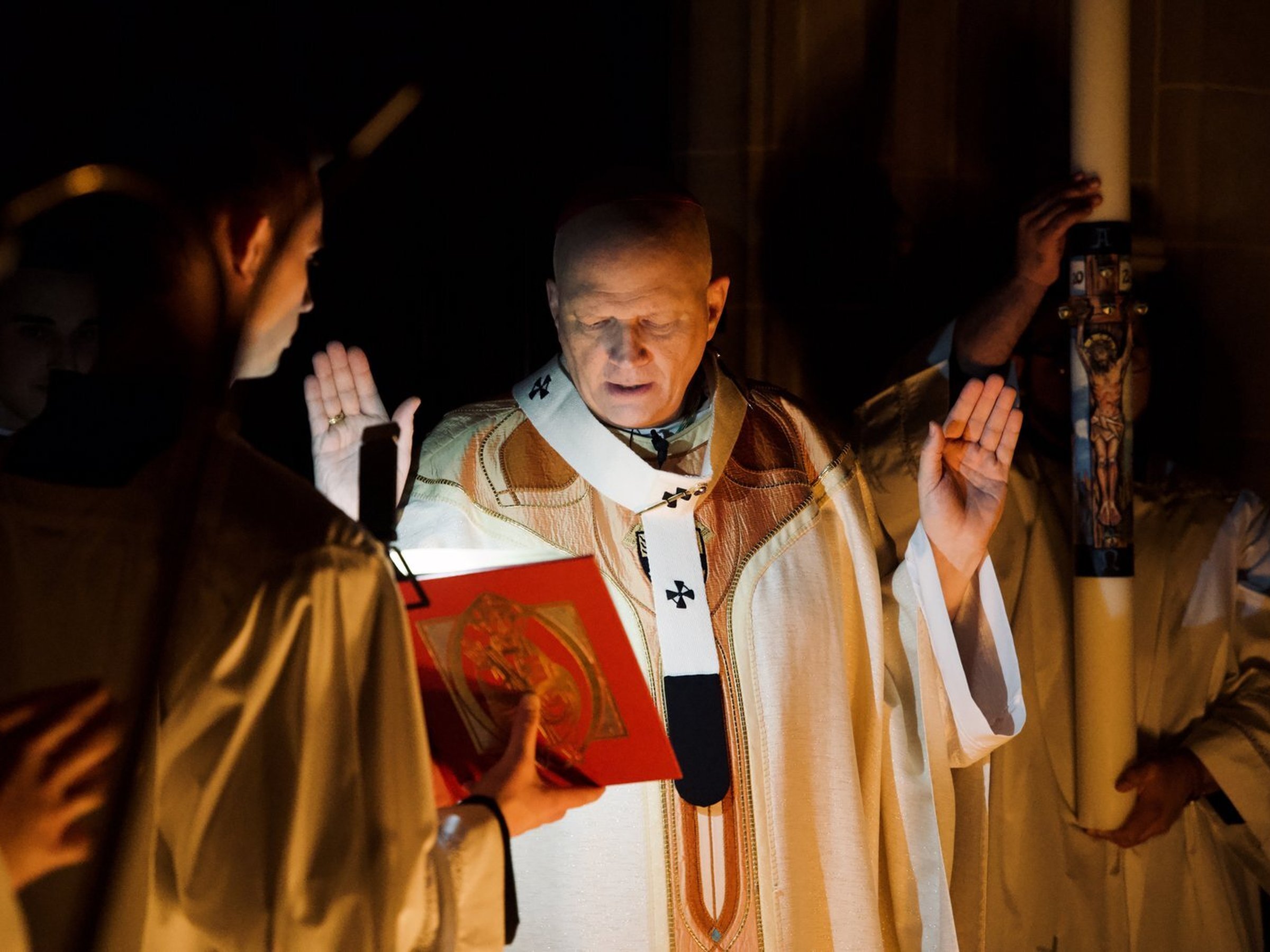 La historia de la resurrección de Cristo y la causa de nuestra alegría no puede contarse sin el sufrimiento, el sacrificio y el dolor, recordó el arzobispo a los fieles reunidos en la catedral para la liturgia, que comenzó en la oscuridad antes de ser iluminada por la luz pascual, símbolo de la gran victoria del resurgir de Cristo.