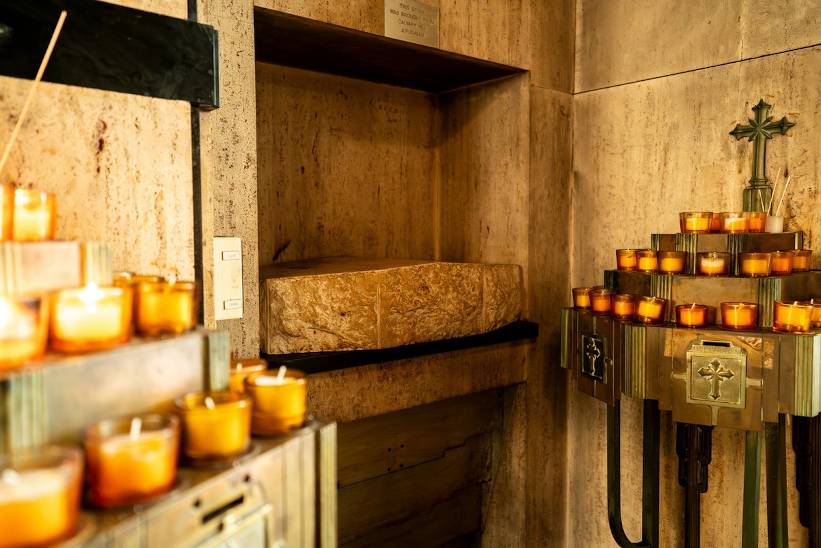 Rohr suele llamar la atención de los visitantes hacia una pequeña piedra cuadrada en el suelo, cerca del sagrario. Se trata de un regalo de Belén entregado por el Papa San Juan Pablo II. A Rohr le gusta pisar esa piedra y caminar hasta el otro extremo, donde pone su mano sobre otra piedra, esta vez proveniente del Calvario, un obsequio del Vaticano a la iglesia en la década de 1940.