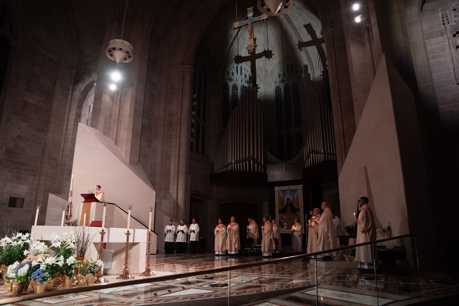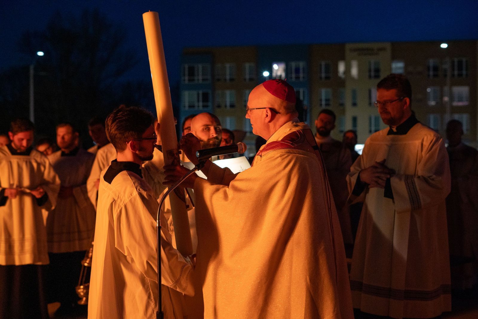 El fuego, símbolo de la Luz que viene al mundo, dominaba la escena en una fresca noche de primavera, mientras el Arzobispo Edward J. Weisenburger se situaba junto al cirio pascual para dar inicio a la celebración más solemne del calendario litúrgico.