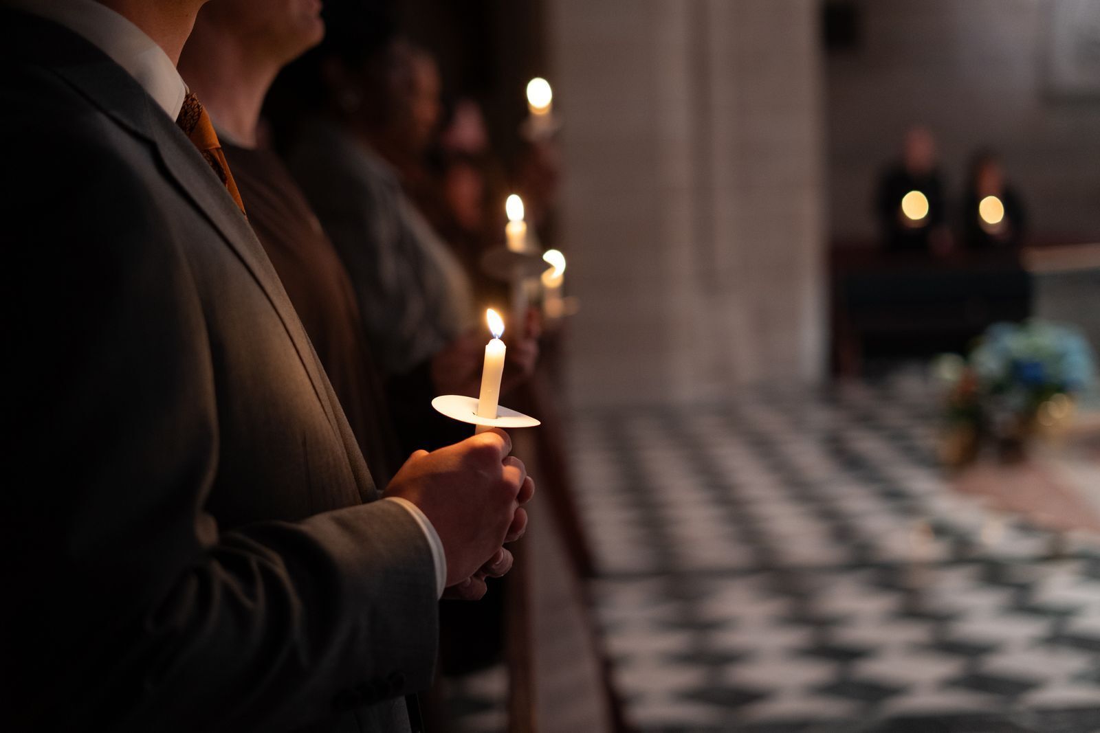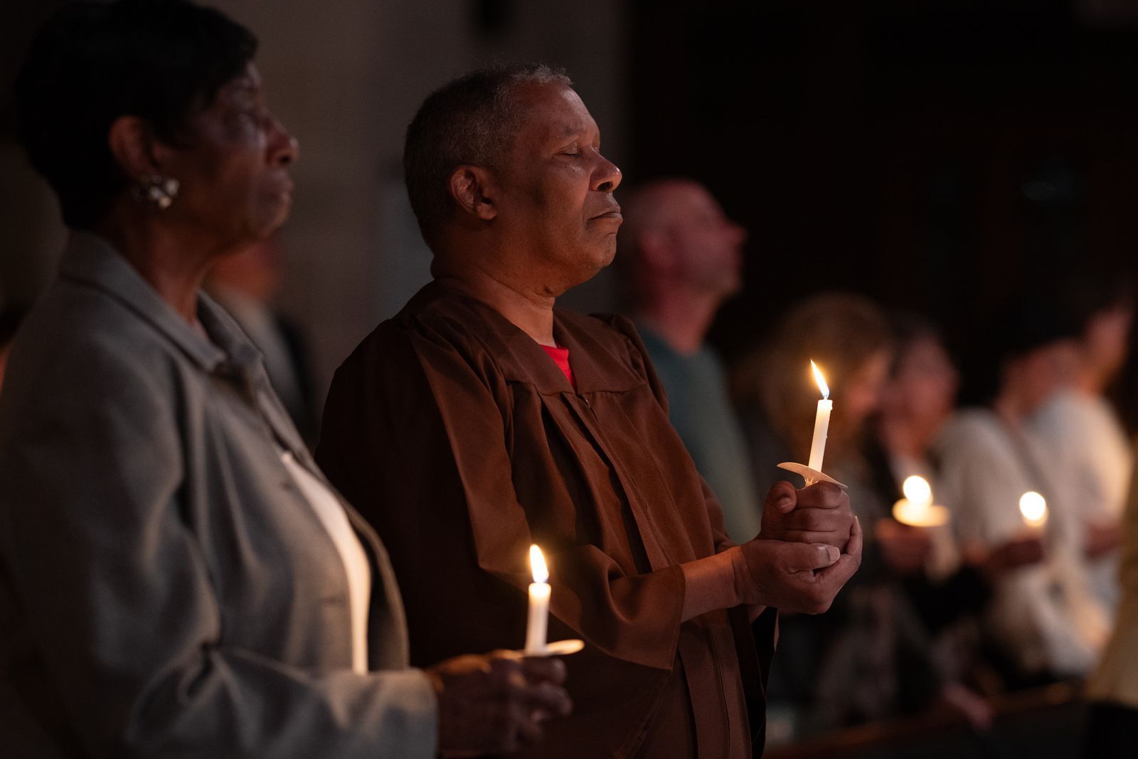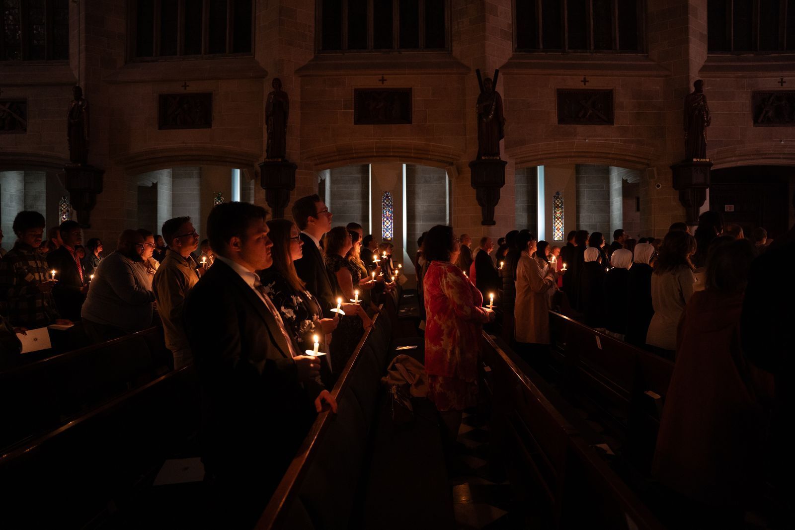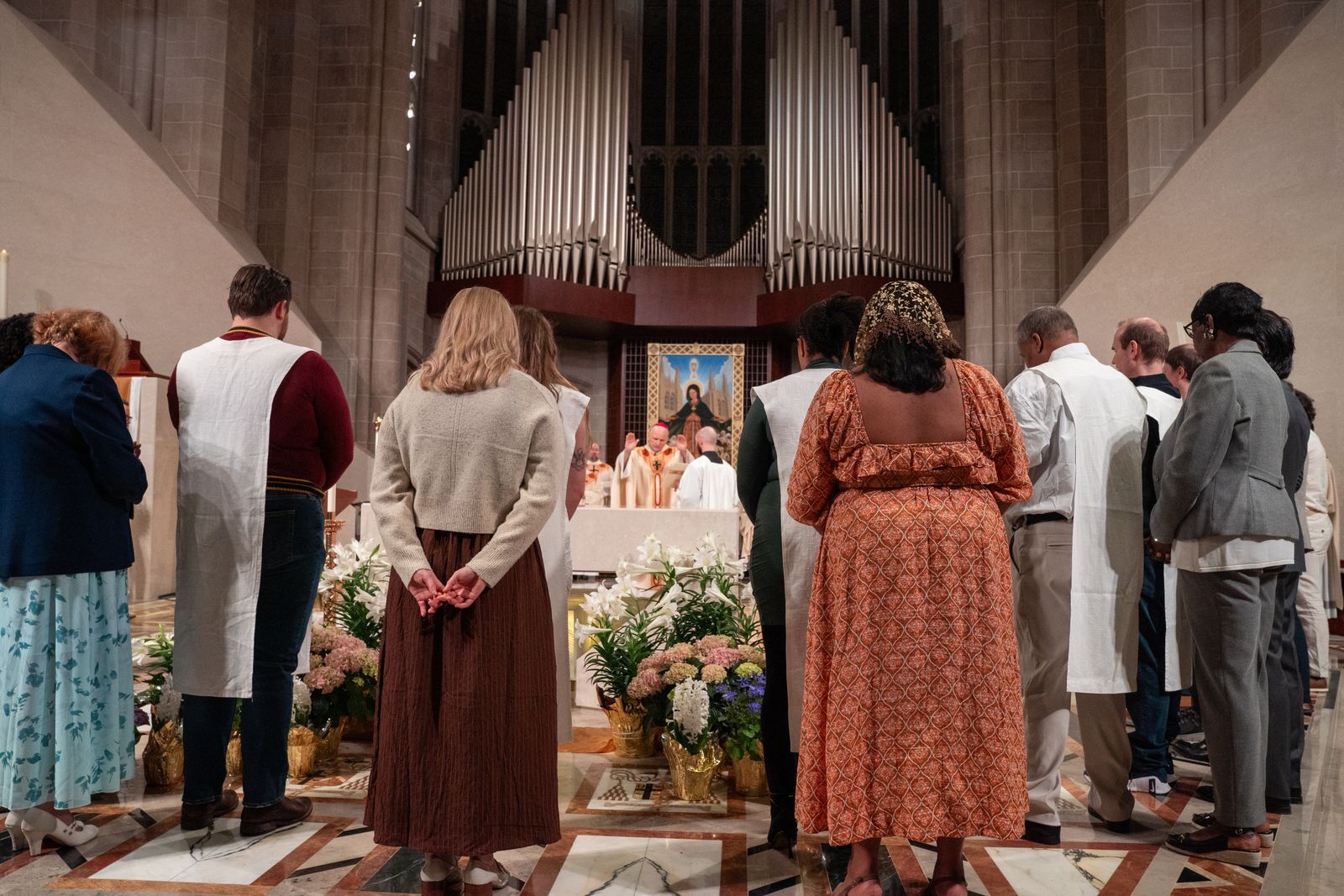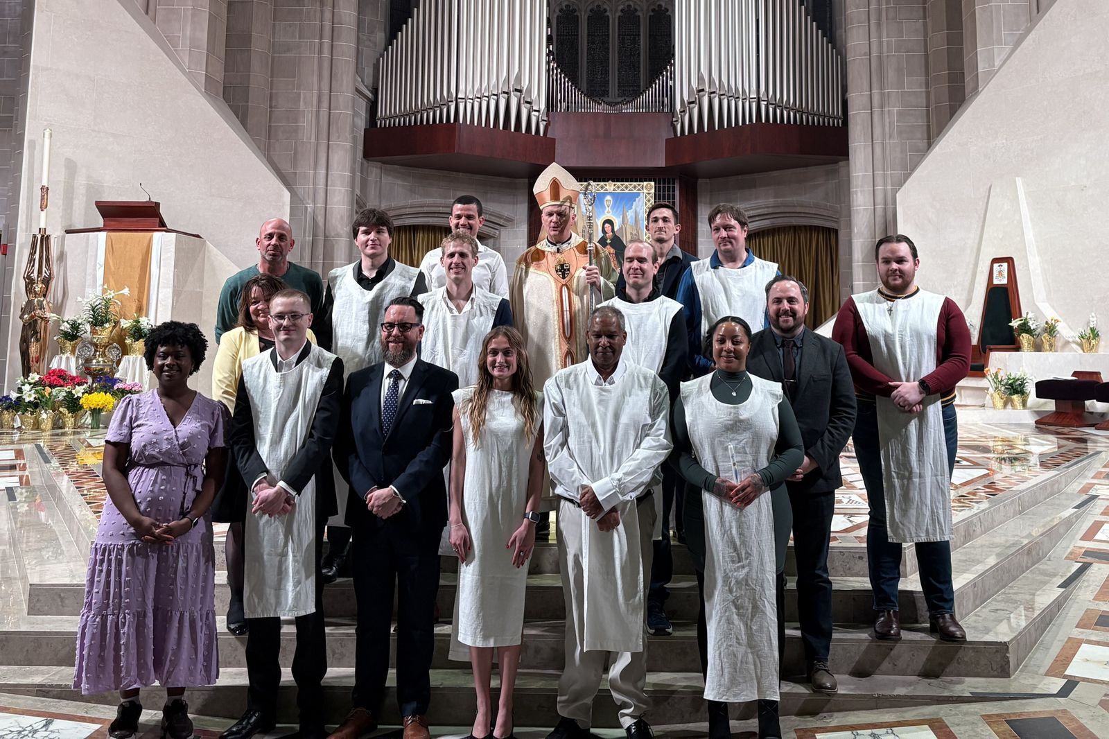 Nueve hombres y mujeres vestidos con túnicas marrones aguardaban con entusiasmo su entrada en la Iglesia —tanto en sentido literal como espiritual— mientras comenzaba la procesión hacia el frente de la catedral, encabezada por el arzobispo Weisenburger con la luz, signo del Cristo resucitado.