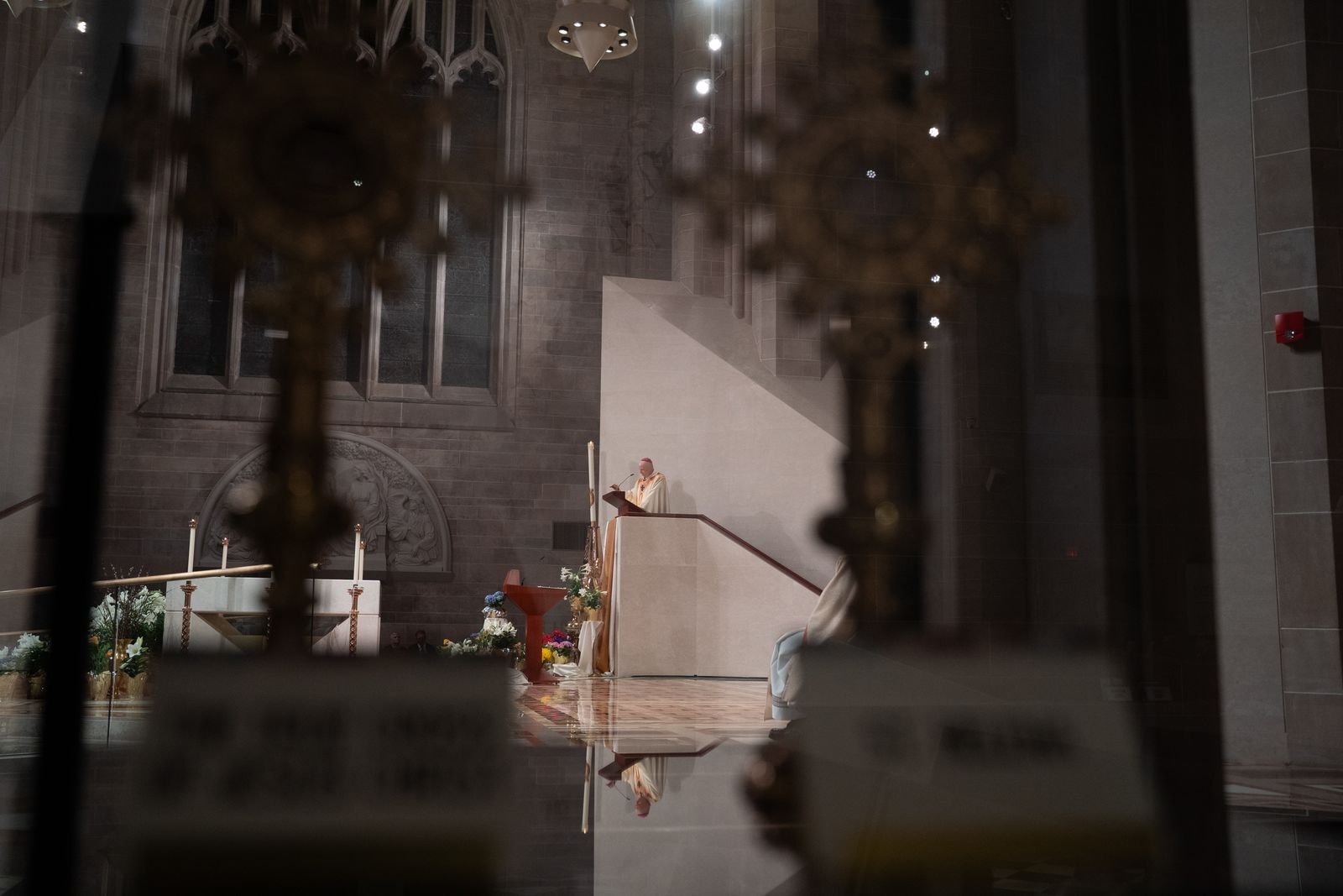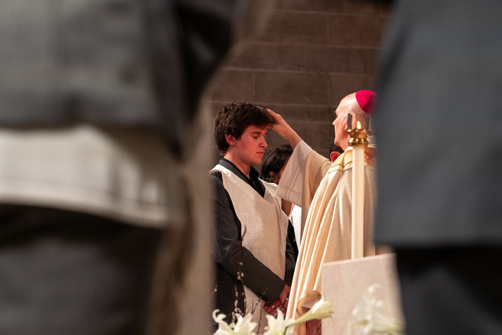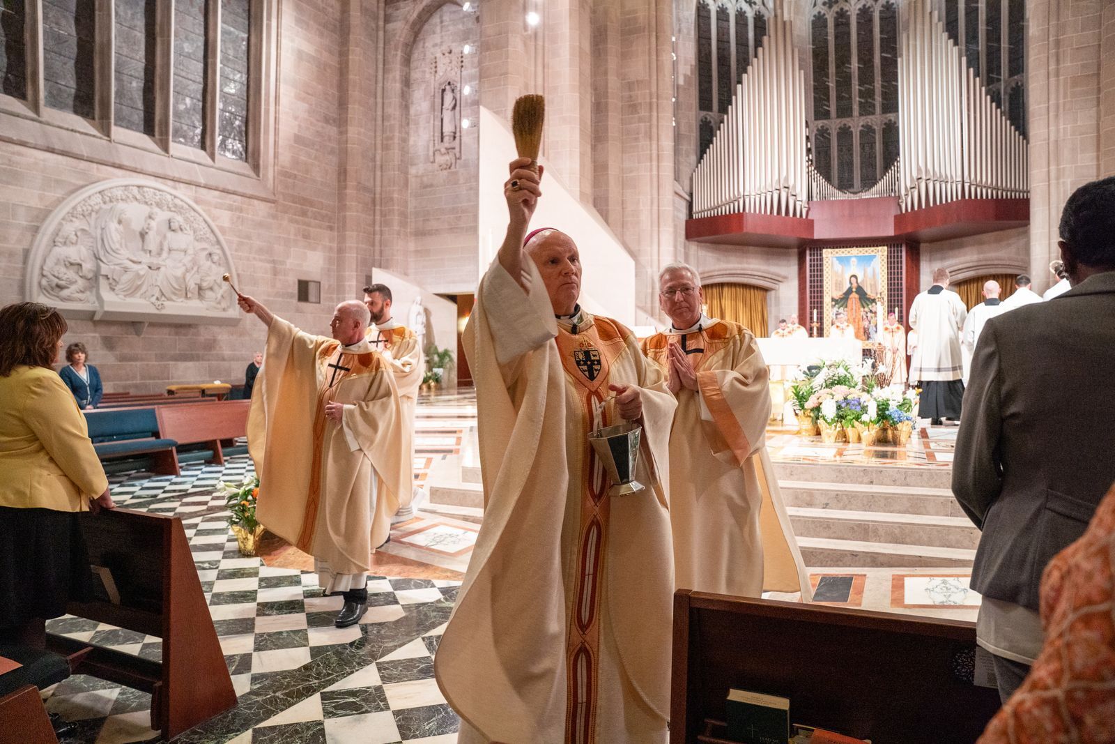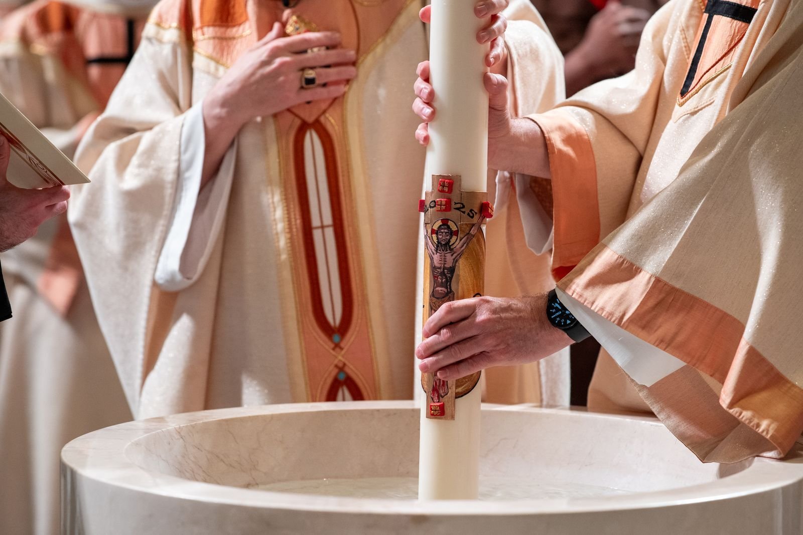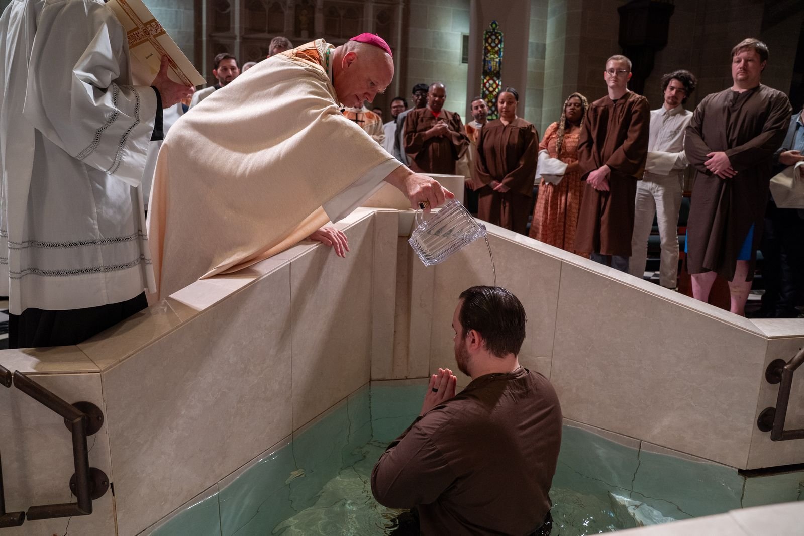 Después de su homilía, el Arzobispo Weisenburger guió a nueve catecúmenos hasta la pila bautismal en la nave de la catedral, donde bendijo el agua y sumergió tres veces el Cirio Pascual. Luego bautizó a las nueve personas, que se arrodillaron mientras el agua bendita bañaba sus cabezas y el Espíritu Santo se derramaba en sus corazones.