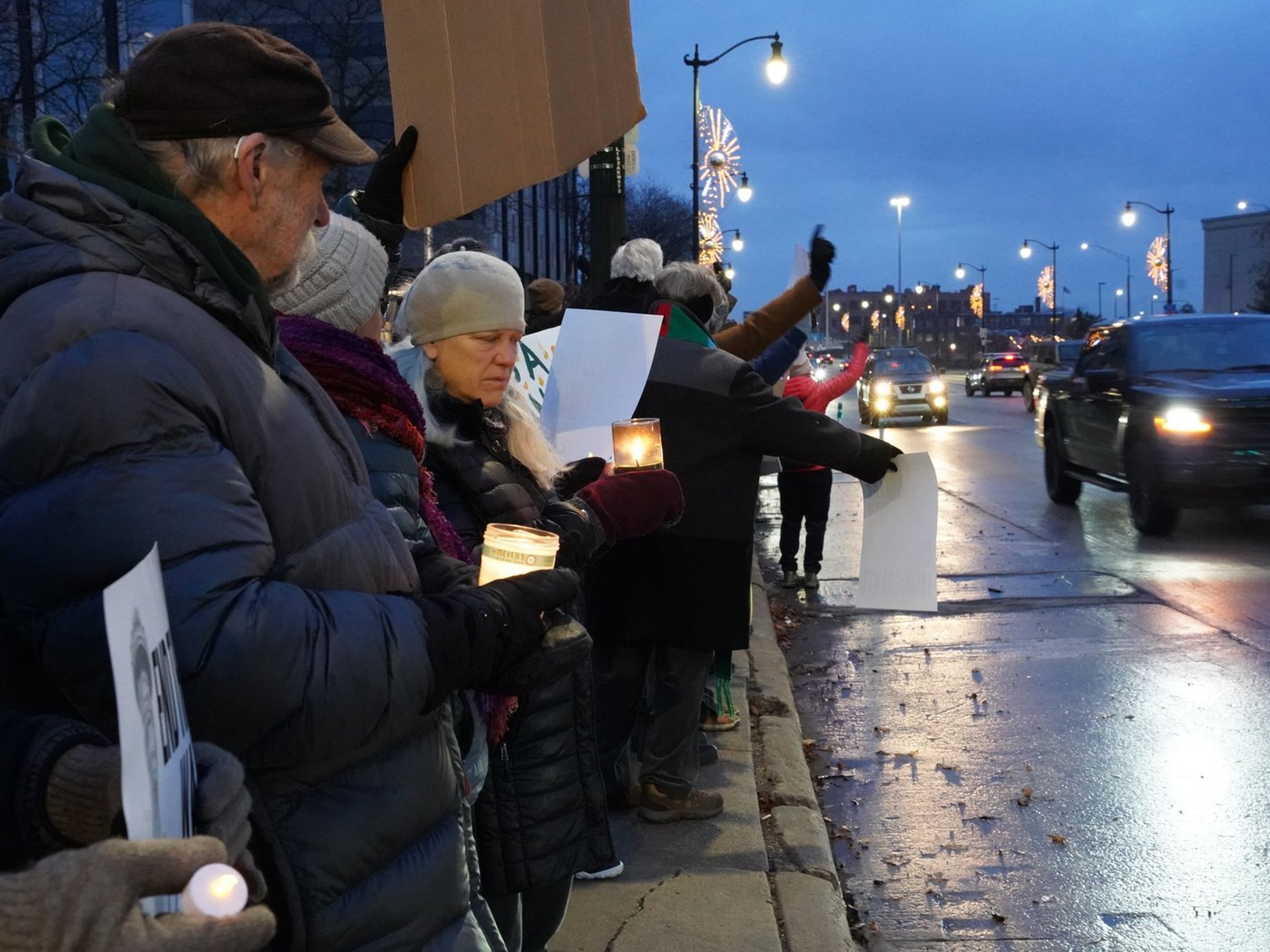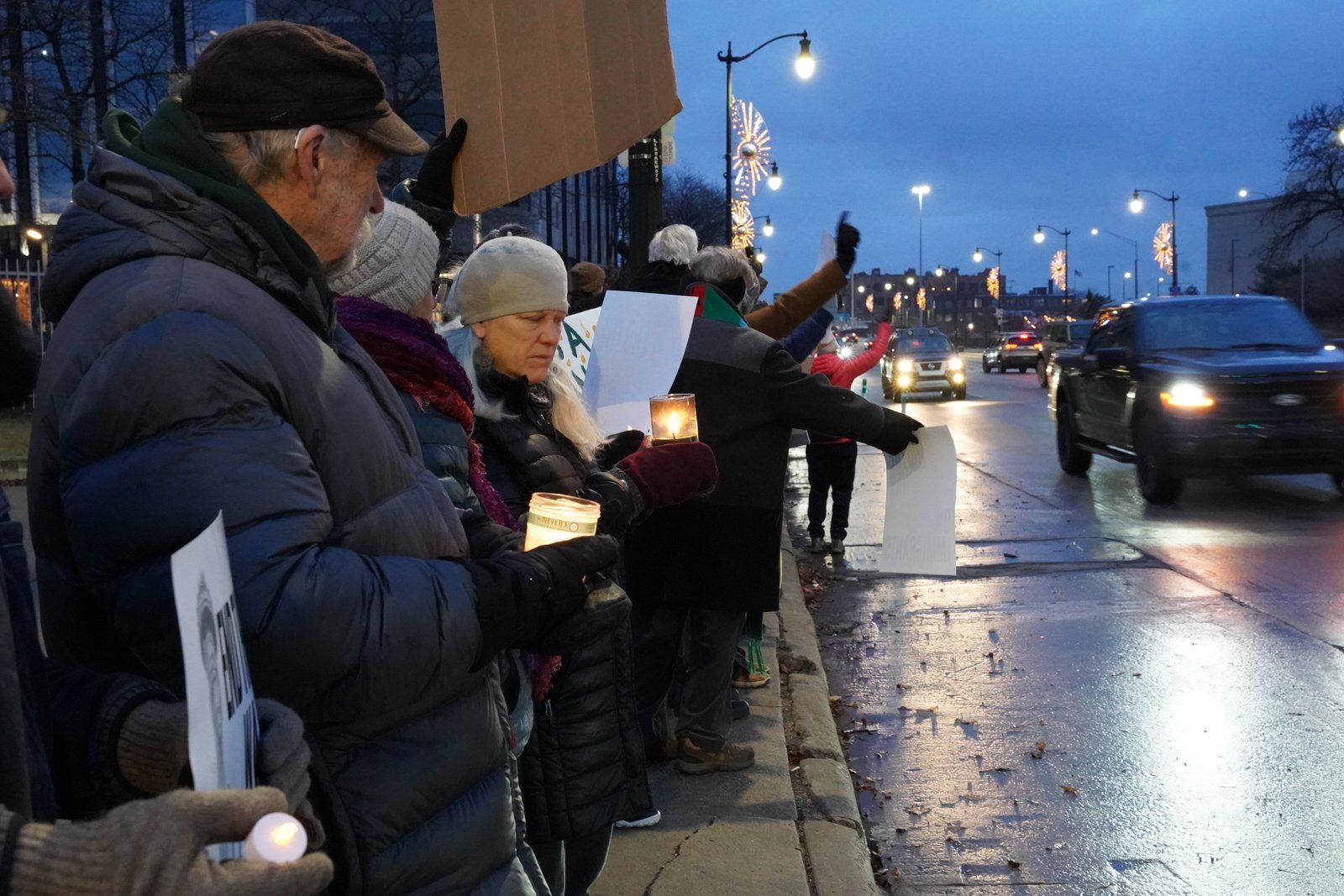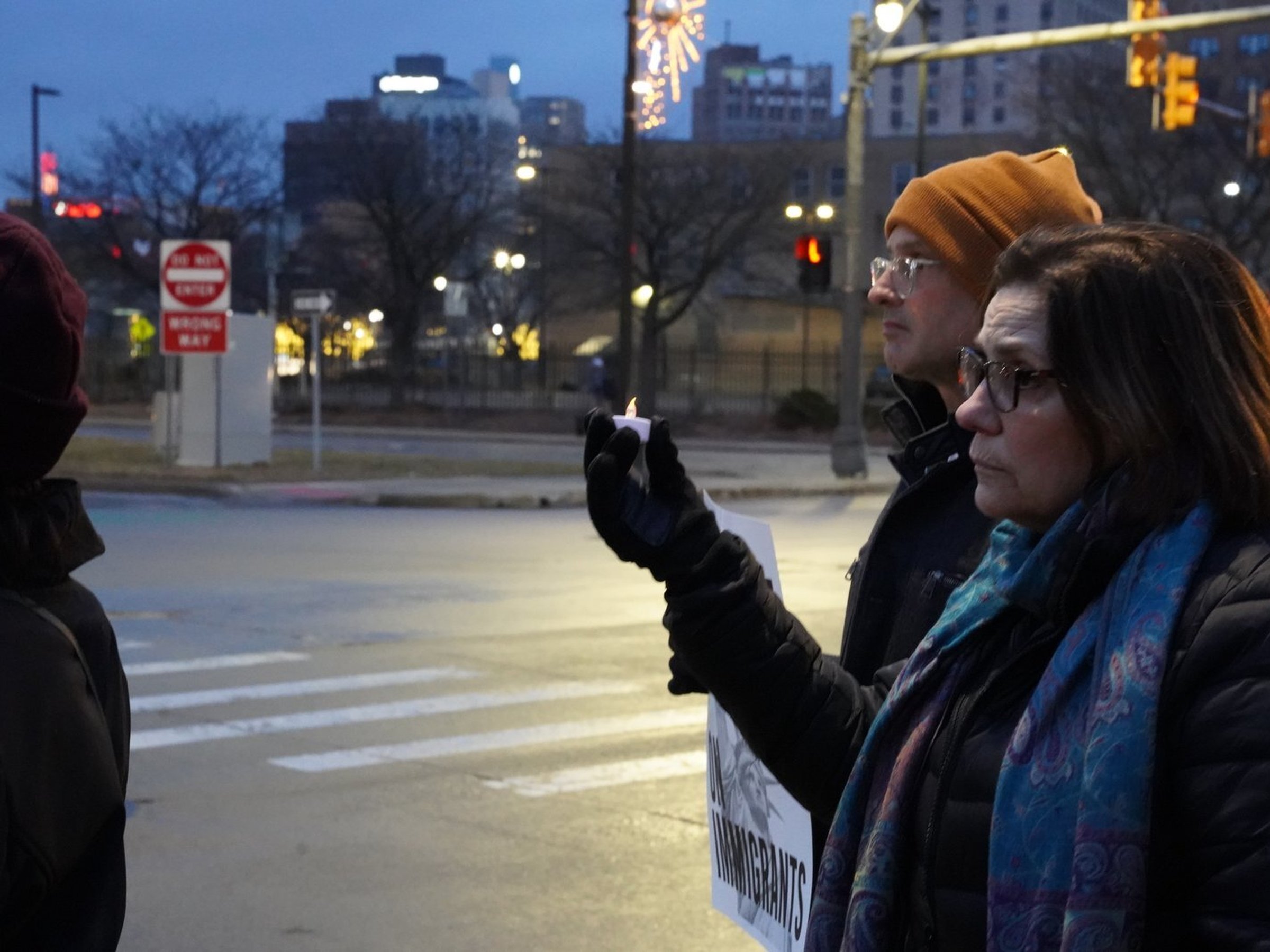 Desde hace meses, defensores de una reforma migratoria se reúnen semanalmente en oración frente a la oficina de campo de ICE, en las avenidas Michigan y Third. En esta ocasión, muchos participantes encendieron velas en memoria de Renee Good, una mujer de Minneapolis que murió el 7 de enero tras ser baleada durante un enfrentamiento con un agente de ICE.