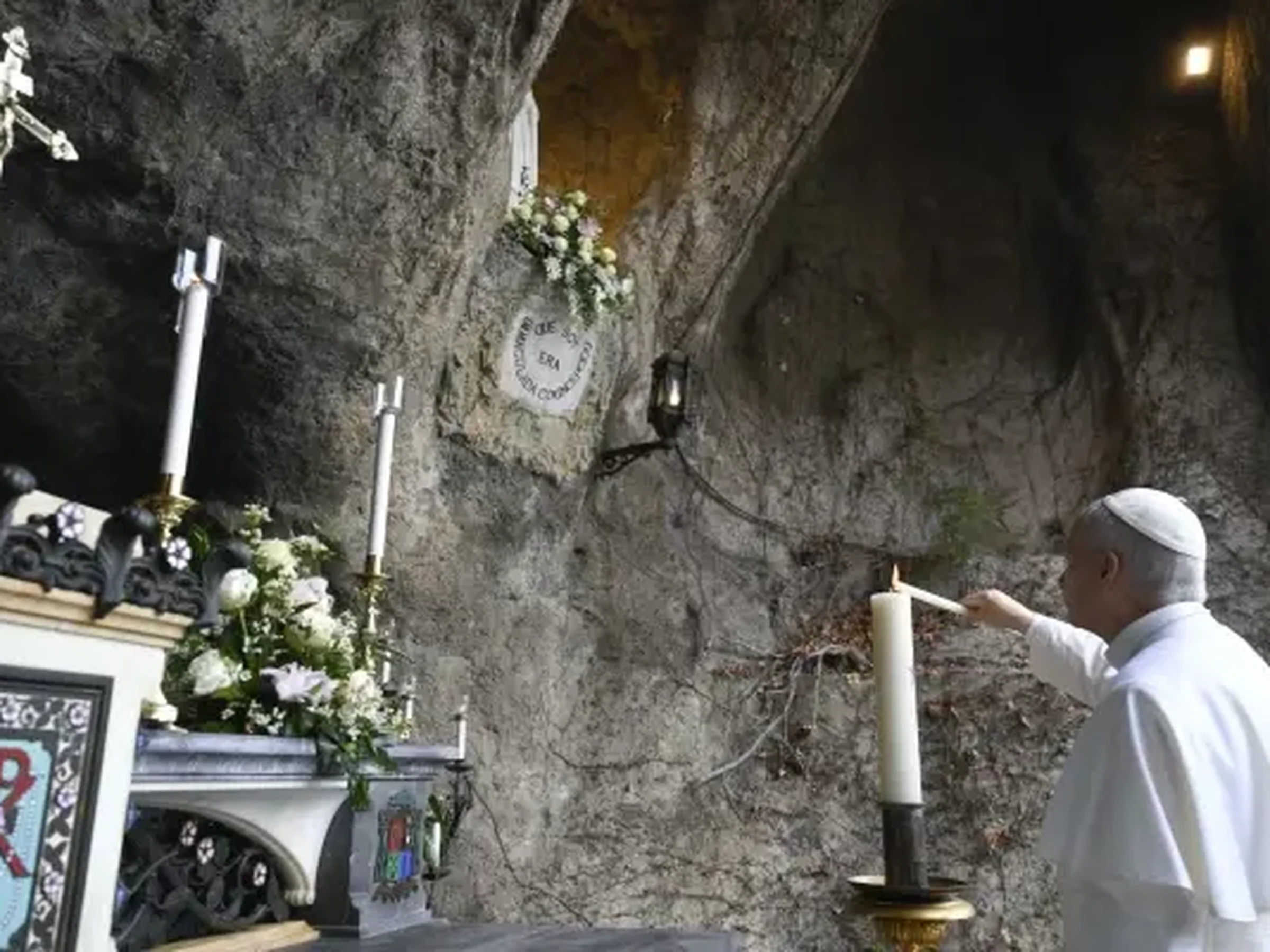 El Papa rezó en silencio ante la Virgen de la gruta y posteriormente encendió una vela como signo de su oración por los enfermos.